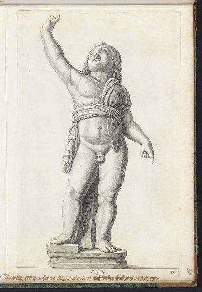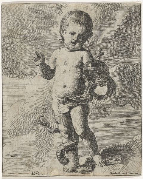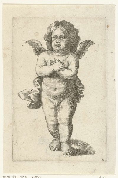 Editor: This is "Standing Angel with Orange" by Pieter van Avont, created between 1630 and 1652. It's an etching, and something about the fine lines and shading gives it this delicate, almost fragile quality. What stands out to you in its composition and form? Curator: The emphasis lies in the figure’s meticulous construction through line and shadow. Observe how van Avont uses hatching and cross-hatching to delineate the contours of the angel’s body and wings. Where does the interplay of light and shadow catch your eye? Editor: Definitely the modelling on the torso and legs. The stark contrast around the belly button emphasizes the angel's soft flesh, doesn't it? Curator: Indeed. Notice also the deliberate lack of strong contour lines. Van Avont uses subtle gradations of tone to suggest volume and three-dimensionality. And have you considered the positioning of the figure within the pictorial space? How does its placement affect your perception? Editor: I'd say that it looks staged? It’s a little awkward how central and forward it is without actually engaging with any implied viewer. Almost confrontational? Curator: Perhaps. That directness contributes to the image’s captivating presence. The precise execution speaks to an intense study of form, typical of baroque-era allegorical and figurative renderings. What new considerations might you bring forward, bearing in mind my description? Editor: The intense focus on anatomical correctness of the form is somewhat offset by the wings. They are proportionally very small. Maybe the small wings suggest the orange in its hands is actually what brings its blessing. Curator: Precisely. Form is the window to content, always. Thank you for highlighting the significance of such a peculiar combination, I’ll have to consider this in future interpretations. Editor: This was enlightening! Now I can focus on how those technical qualities contribute to its overall meaning.