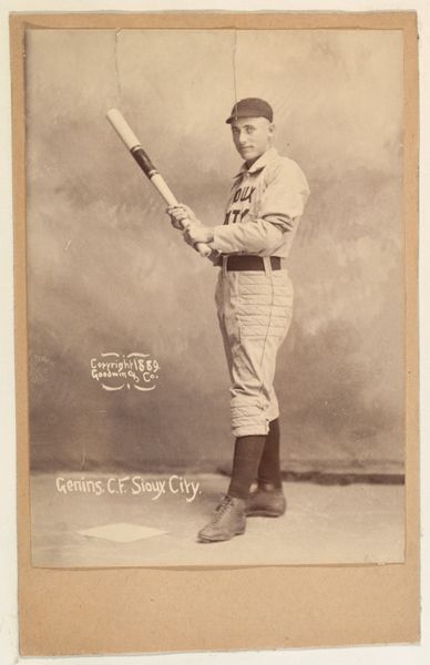 Editor: This is a photograph from 1889, part of the "Old Judge" series by Goodwin & Company. It depicts H. Smith, a shortstop for the St. Joseph Clay Eaters. The sepia tone gives it a wonderfully antique feel, but I’m struggling to understand his hand gesture, which looks rather prayer-like, right before catching a baseball? What's your take on this piece? Curator: That prayer-like gesture is key, isn't it? It's about luck and superstition, very potent cultural forces, deeply interwoven with baseball even today. But consider this further: what does it mean to see this "everyday" scene depicted within the frame of commercial advertising for Old Judge Cigarettes? Does it elevate the ballplayer or cheapen religious observance by linking a product like cigarettes with what you characterize as sacred gestures? Editor: That's a fantastic point. It definitely complicates the reading. The cigarette advertisement framing turns the shortstop almost into a symbol—but a symbol *of* what? Of rugged Americanism, or merely of consumerism? Curator: Or, perhaps, both? Therein lies the tension. The symbol is not fixed but fluid. Early baseball cards become secular icons to be collected, traded, adored...even the *brand* of cigarette takes on some of that symbolism. The pose, his steady gaze, his ‘uniform,’ all these cultural associations get wrapped up in the photograph. And because this photograph also serves as a portable item circulated across geographic locations, does it mean there may be differing reactions across regions regarding tobacco use or sporting figures? Editor: That makes me rethink the power that images held then and now—for creating memories and for encoding social messages that circulate for generations. Curator: Exactly! Visual culture provides communal memory. I am so glad you saw that.