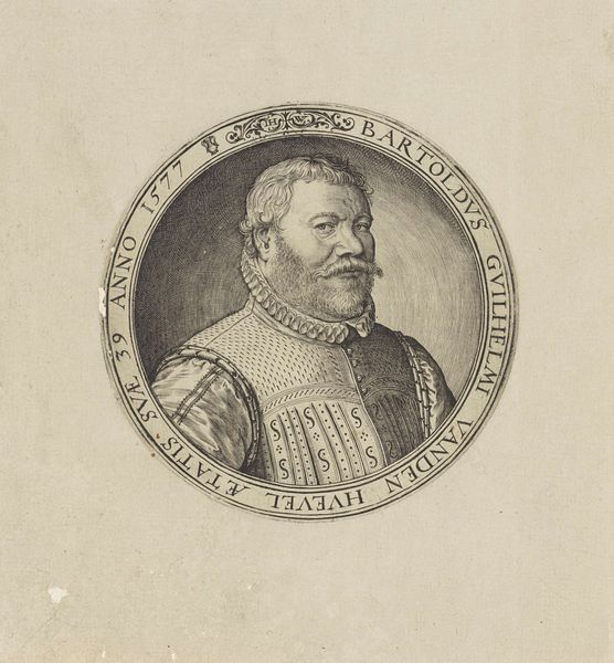 Curator: Editor: Here we have Hendrick Goltzius's "Portrait of a 32-Year-Old Man against the Background of an Oak Leaf," from 1579. It’s an engraving, and there’s something almost unsettling about the level of detail he achieves. What do you see in it? Curator: I’m immediately drawn to the materiality of this print, and what it tells us about 16th-century artisanal production. Goltzius, first and foremost, was a master engraver. How do you think the production process influences the message conveyed? Editor: Well, I hadn't really thought about that. It strikes me that he’s deliberately chosen printmaking to depict this gentleman. Maybe to democratize the image and mass-produce and disseminate it, thereby increasing social status. Is that feasible, though? Curator: Absolutely! Engravings allowed for wider distribution, signifying status through reproduction. Also, consider the engraver's labor involved in each print, replicating the image repeatedly. How might the act of repetition play into the art's meaning, beyond mere distribution? Editor: Perhaps the act of meticulously re-creating the portrait mirrors the sitter's desire for permanence or memorialization? It adds a layer of intention. Plus, the oak leaf backdrop now seems less ornamental and more related to its presence as a sustainable material object... Curator: Exactly. The very act of creating multiple identical impressions underscores themes of permanence and legacy but also considers the economy of materials inherent in printmaking versus say, painting. This engraving provides more access for others than a traditional oil on canvas may offer... Editor: I see now. It is like how modern factories produce hundreds of the same car; the choice of medium allows for democratization of status... I would never have thought of the printing itself adding to the work's message without you. Curator: It is the way the medium is intricately tied to not only status but Goltzius' commentary on the same. He isn't simply depicting an image, he is actively producing a means by which ideas of status were actively reproduced and negotiated, especially between artists and their benefactors.