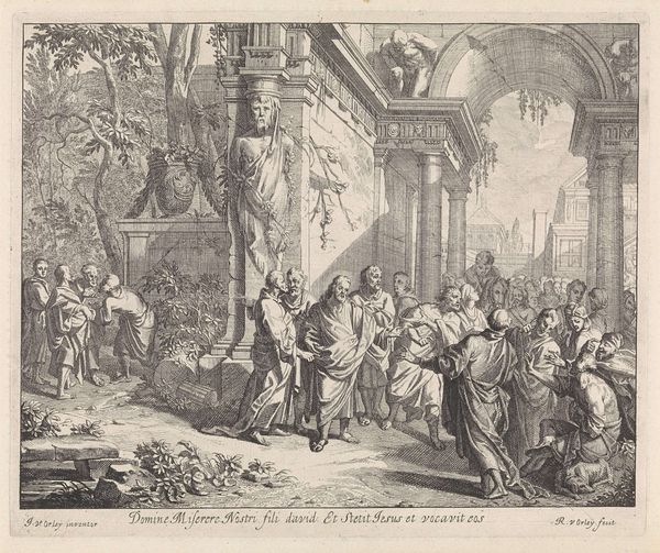 Editor: This engraving by Jean Moyreau, made in 1726, is called 'Hector Takes Leave of Andromache.' The starkness of the black and white and the detail in the figures create a really intense scene of farewell. What's your interpretation of it? Curator: Well, let’s consider the means of production here. Engraving was a readily reproducible medium in the 18th century. Think about its use; this allowed for the widespread dissemination of images, especially of historical or genre scenes, to a bourgeois audience eager to consume stories of heroism and tragedy. How do you think the choice of this medium affects our understanding of the artwork? Editor: It’s interesting that it was designed for reproduction... almost like a really high-end, elaborate newspaper comic. So the accessibility and lower production cost makes this art a product available to a wider audience beyond, say, just wealthy art patrons? Curator: Exactly! Consider the socio-economic context. The engraving process itself – the labour involved, the accessibility of materials – democratizes the imagery, turning even grand narratives into commodities. Is Moyreau critiquing or celebrating this accessibility, do you think? Editor: That's a tough question. The skill involved suggests celebrating craftsmanship. The scene depicts elites and it appears this kind of ‘genre’ of image consumption caters to aspirational values of middle-class audiences of the time. Curator: Precisely! It speaks volumes about the consumerism around these classical narratives in the 18th century and, for me, forces a reassessment of the social role of "high" art at that time. Editor: I never really thought about engravings in terms of the materials and means of production impacting their cultural significance. Curator: That’s exactly the point! Focusing on materiality changes how we value and interpret art.