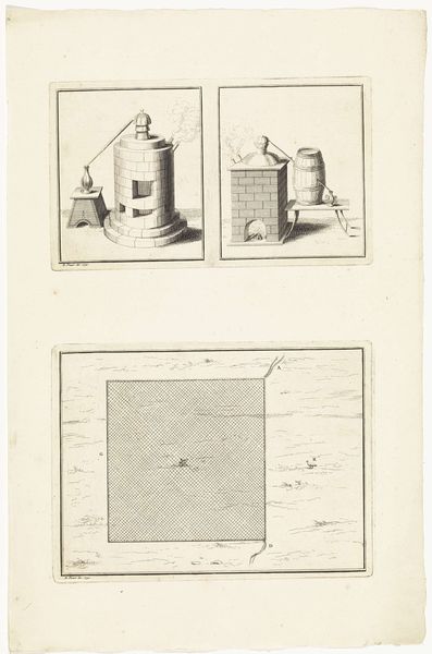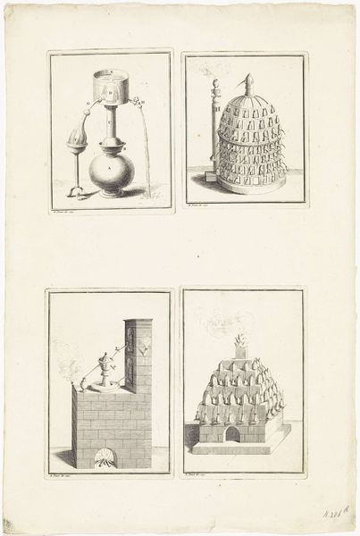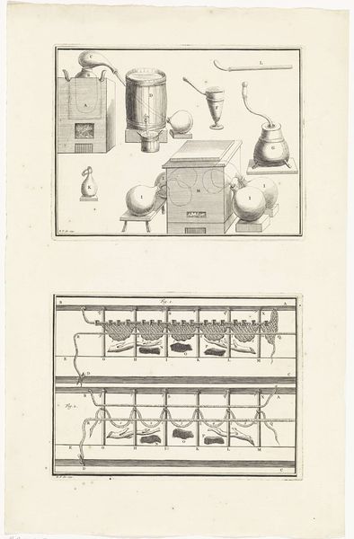 Bernard Picart created this print titled "Verschillende destilleerapparaten", or "Different Distillation Devices," at an unknown date. It offers a glimpse into the world of early scientific exploration during the Enlightenment. During this time, experiment and observation were key to understanding the natural world. Picart, a French engraver, provides us with detailed images of the tools used in alchemy and early chemistry. These weren't just instruments; they were pathways to knowledge, tools for transforming substances and, metaphorically, transforming understanding. But who had access to this knowledge? The world of science, like many fields, was dominated by men of a certain class and education. This print hints at the hidden labor and knowledge of those often unacknowledged: the assistants, servants, and women who may have played roles in these experiments. As you look at the delicate lines of the engraving, consider the complex social structures that shaped the pursuit of knowledge. The pursuit of knowledge, then and now, is always a story of who gets to ask the questions.