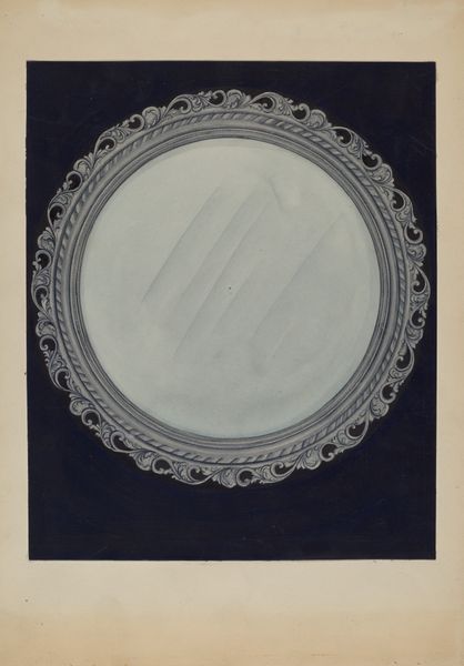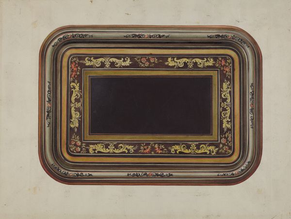 Mary Fitzgerald made this artwork titled “Tray” at an unknown date using unspecified materials to create a drawing that measures 45.5 by 35.5 centimeters. The drawing presents an oval form, which dominates the composition with its stark contrast against the plain background. The central field of the oval is a study in monochromatic darkness, achieved through layered shading that suggests depth and texture. Encircling this void is a decorative border, meticulously detailed with organic motifs—floral and foliate elements rendered in ochre and red hues. These small, precise figures break up the dark plane and invite closer inspection of the artist's control of form and line. Through the interplay of light and dark, Fitzgerald prompts us to reconsider the functional object as a site of aesthetic engagement. The artwork challenges fixed meanings by pushing beyond its utilitarian purpose.