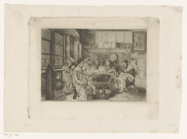 Curator: What stands out is the emphasis on the everyday—the intimate scene of a family meal rendered with simple charcoal or pencil. Think about the artist’s choice to represent such a quotidian moment, one involving gathering and labor. Editor: We're looking at "118 E. Pearson" by Anne Michalov. It appears to be a charcoal or pencil drawing of a group of people around a table, maybe a family dinner. It's interesting, almost like a snapshot, but also carefully composed. What draws your attention most in this work? Curator: The rough texture and monochrome palette highlight the raw materiality of the drawing process itself. Do you notice how the depiction of family is centered by labor; preparing and eating food? Editor: I do. The textures and varying darkness definitely make it feel immediate and kind of…real. Do you see the choice of such an ordinary scene of dining connected to broader ideas? Curator: Absolutely. By focusing on a common scenario using readily available materials, Michalov is making a statement. Art isn't just about grand subjects or expensive media; it's also found in observing life through a materialist lens of accessibility. This challenges any hierarchy between high art and everyday life. Also, observe how this intimate image hints at larger social rituals. Editor: So, by using such humble materials like charcoal and paper to depict something as normal as a family meal, the artist kind of democratizes the whole idea of what art can be? Curator: Precisely. We see how the making and subject become accessible through these mediums. It makes you think about who is included and excluded in art, both in terms of making and observing. What’s your takeaway now? Editor: I initially saw it just as a nice drawing of a family. Now I appreciate that the artist employed such simple materials. Curator: I think you see it like I do now— as an important lens for challenging notions of art and what it means to elevate simple events, or those involving labor, into images of meaning.