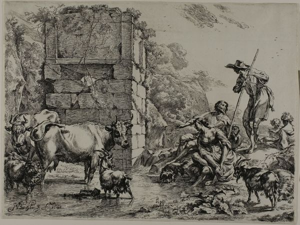 Curator: Welcome. Before us is "Ruiters bij drinkplaats," or "Riders at a Watering Place," an engraving and etching attributed to Anthonie van den Bos, dating sometime between 1778 and 1838. Editor: Well, isn’t this just brimming with nonchalant elegance? The riders and their horses, the casually posed dogs…it’s all very "day in the life of leisure," but there is this palpable tension too. Like something interesting just happened, or is about to. Curator: Interesting that you sense tension. This genre scene taps into the societal norms of its time, idealizing rural life but also reflecting class distinctions through activities like horseback riding, often a symbol of status and privilege. The dogs, too, mark social positioning. Editor: Yes, "privilege" absolutely sings out. Though I'm also struck by how enclosed the composition feels. The dark craggy hill on one side and what seems to be a building fragment on the other, they almost squeeze the figures, which for me, sets a dramatic and exciting stage! Almost filmic, even. Curator: Precisely. The artist uses the landscape not just as a backdrop but to frame and emphasize the human activity. Consider how printmaking, as a medium, allowed such scenes to circulate widely, disseminating ideas about landscape and social life. We also can’t forget the impact the Dutch Golden age had on landscape and genre paintings at this period. Editor: Good point, good point... and do you think that compressed perspective might signal something beyond aesthetics? Like a sense of limitation or constraint for these otherwise "free" riders? Maybe the building fragment and that dark, monolithic mountain face symbolizes barriers for progress or exploration? I am really intrigued. Curator: That interpretation is certainly valid, acknowledging art's power to provoke multiple readings shaped by different cultural contexts. These prints are also testaments to the era's fascination with representing daily life while hinting at underlying social narratives. Editor: Agreed. The artist prompts us to contemplate our own lives of freedom but simultaneously to acknowledge any real and present limits. This image leaves me with something to consider further - perhaps over another cup of coffee. Thank you for offering some enriching historical context for my meandering thoughts! Curator: The pleasure was all mine. These historical lenses help contextualize our emotional reactions to this captivating image, indeed something worth pondering even after our visit to this gallery concludes.