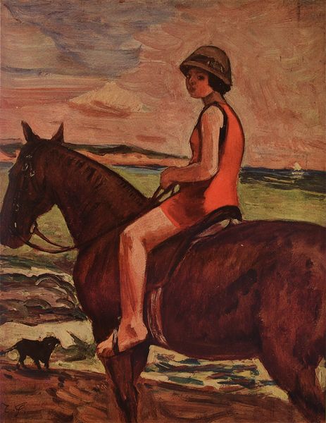 Curator: This is an oil-on-canvas painting called "Negro boy on a bay horse" by Thomas Eakins. Editor: My first impression is one of starkness. The palette is quite muted, primarily greens and browns, and the brushstrokes, while expressive, have a direct quality. Curator: Yes, Eakins often sought to capture unfiltered moments in everyday life, elevating genre painting through his acute observations of human activity and rural settings. He attempts to faithfully represent the boy’s and horse's place in that landscape. Editor: Looking at the composition, it feels slightly unbalanced. The figure of the boy and the horse are pushed towards the center, leaving a lot of open, somewhat amorphous green space. It almost feels incomplete. Curator: But consider what a stable symbolizes--domestication, labor. By including this image and not an idealized version, Eakins forces the viewer to reconcile pastoral beauty with complex and possibly uncomfortable social dynamics present in this country’s past. The cultural memory surrounding labor, race and American life resonates strongly. Editor: I appreciate that tension, though formalistically, I’m still struggling with the lack of precise details. Everything feels very loose, perhaps an unfinished sketch. Curator: Perhaps this sketch-like quality amplifies that liminal feeling, mirroring an in-between status that’s about much more than this moment, but one that the American psyche finds so difficult to confront. There are historical silences surrounding figures like this young rider, one to ponder as we look more carefully. Editor: So, beyond simply portraying a figure in a landscape, this painting functions as a vehicle to access deeply felt, unresolved issues within society's memory, using recognizable and traditional tropes, in ways that are simultaneously visible and masked. Curator: Exactly, which speaks volumes about the artist’s concerns as well as his audience and his place within this complicated web of meanings. Thank you for that fascinating look at the interplay between art and context here! Editor: Likewise. Considering Eakins’ construction through technique brings a fresh understanding to a seemingly simple scene.