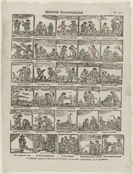 Curator: Here we have an engraving, "Alderley soort van ambagten ziet gy hier / Elk bezonder toond zyn konsten na de zwier", created sometime between 1725 and 1780 by Johannes (II) Kannewet. It’s a fascinating example of Dutch Golden Age printmaking currently held at the Rijksmuseum. What are your first impressions? Editor: My goodness, it looks like a comic strip about…everything? It's like a visual encyclopedia of trades, all crammed together. Kind of dizzying but wonderfully so! Curator: Yes, the composition is rather unique. The artist presents us with a series of small, framed vignettes. Each depicts a different craft or trade. Note the careful attention to detail in each scene. We can appreciate the mastery in translating such intricate activity into engraving. It’s essentially a typological overview. Editor: Intricate is definitely the word! I'm zooming in on the baker shoving a loaf into his oven, and then right next to him, some dude is meticulously shaving someone's face. And each little picture has a little description on it as well! It feels like walking through a really bustling, organized town square. What do you make of its placement within the Dutch Golden Age? Curator: During this period, genre painting flourished, capturing everyday life with meticulous detail and symbolic nuance. Kannewet’s print builds upon this tradition, systematizing trades as worthy subjects of artistic attention, and reflects broader social interests in categorizing and understanding the burgeoning Dutch economy of the time. Editor: Absolutely, and each tradesperson's labor feels not just functional but deeply dignified. Look at the archer – he isn’t just practicing archery, but representing a skill, an art, that’s been passed down through generations. There is such clear pride visible. It has me longing for the days of simpler forms of working the land and simple artistry. Curator: It is certainly evocative. As we look at this piece, we observe Kannewet's sophisticated engraving skills, documenting social practice and offering insights into Baroque sensibilities through form and content. Editor: I'm completely charmed by it and ready to go try and make my own barrel, badly. This has been delightful!