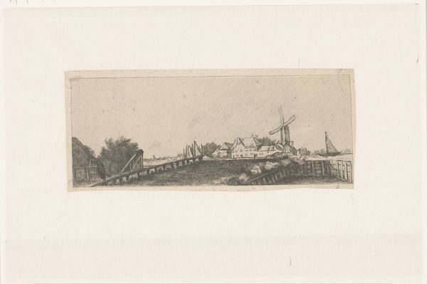 Editor: So this is "Dijkdoorbraak bij Dreumel, 1855", by Willem Gruyter jr., made using an engraving. The landscape feels both dramatic and desolate – all that water, that one little house seemingly stranded. What strikes you most about it? Curator: Ah, yes, a landscape consumed by an epic fail, nature turning on its own human constructs! It’s all in shades of grey but whispers stories of fear and resilience. Look closely at the turbulent water; Gruyter captures its raw power with simple lines. There's a certain beauty amidst the destruction, a poignant dance of light and shadow, don’t you think? But what about that single house? Editor: It looks so vulnerable! Like a toy house abandoned in a bathtub. I hadn’t considered the light before, though; the bright clouds sort of soften the scene. Is that supposed to provide comfort in a way? Curator: Comfort? Perhaps a flicker of hope? It may symbolize something stronger; it has to carry on for the inhabitants. It shows you nature’s might, which can be terrifying, can make our lives almost pointless, and in art there's a certain comfort. It helps to digest something traumatic. Did it change how you perceive it at all? Editor: Definitely. The drama is still there, but there's this subtle defiance too. Like, “we’re still here despite the flood.” The idea of wrestling and working through things gives some peace of mind. Curator: Indeed, the print now sings not only of loss, but the spirit to pick up the pieces, find something good still. It reminds us we're a part of nature after all, fragile but ever resourceful! Editor: Thanks, I didn't think it would come out in just that black and white depiction. So simple!