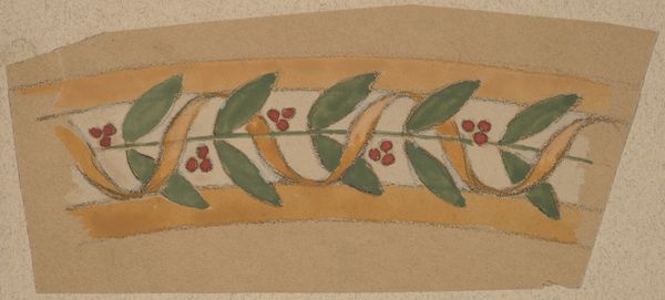 Curator: This watercolor study created between 1890 and 1897 by Charles Sprague Pearce is entitled, "Study for a Border Design". Editor: It's calming. The muted earthy tones give it a very quiet, almost contemplative quality. It reminds me of botanical illustrations but with an intentional flattening of space. Curator: Note how Pearce employs horizontal bands that emphasize the two-dimensionality of the paper. There's a careful calibration of the space between the leaf and berry motifs, the pink band and the ochre borders—everything is working to establish the pictorial surface as an organized whole. Editor: Yet, understanding it as solely decorative ignores the broader social context of the Arts and Crafts movement of which Pearce was a part. His choice of natural, stylized forms reflects a desire to return to traditional craftsmanship in the face of industrialization. This artistic choice becomes a social statement. Curator: Precisely. The stylization transforms organic forms into units within a larger geometric structure. The color palette of earth tones evokes the pre-Raphaelite brotherhood’s fascination with a purified natural aesthetic. Notice how this work refuses any traditional modeling or attempts at perspectival depth, signaling a departure from academic naturalism and favoring surface decoration. Editor: What about this decorative impulse as more than aesthetic choice, but a gesture of inclusivity? Decorative art has historically been created and consumed by a wider segment of society. Curator: I see your point about broadening accessibility and the challenge to high art hierarchies. Pearce strategically integrates this aesthetic sensibility, inviting viewers to find beauty in everyday objects, potentially democratizing access to beauty through design. Editor: Exactly, it isn't just about appreciating beautiful things. It's about the underlying philosophy questioning the divisions within social stratifications, which for me elevates it beyond merely a formal study. Curator: Well said, our differing viewpoints allows us to examine how a relatively simple study can trigger profound contemplation about art, society, and visual experience. Editor: Indeed. These dialogues help unearth layers of understanding beyond the initial visual encounter.