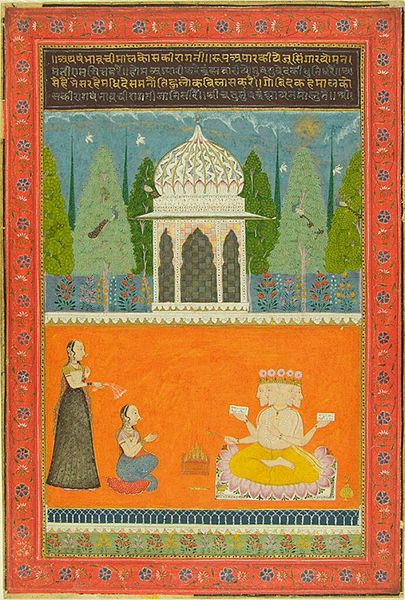 Editor: Here we have the painting *Asavari Ragini* by Jai Kisan of Malpura. The artist used paint and paper to create this mesmerizing scene with a musician and snakes. What strikes me is the use of such vibrant colors. What do you see in this piece? Curator: Looking at this Ragamala painting, I'm drawn to the materials themselves. The pigments, likely sourced locally, speak to trade networks and the availability of resources. How does the layering of these colors, possibly mineral-based, affect your understanding of the image's creation and its original cultural context? Editor: It gives me a deeper appreciation for the skill and effort involved. Thanks for pointing that out! Curator: It speaks to how the material informs the meaning.