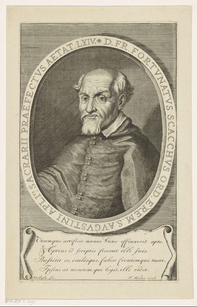 Editor: Here we have Johann Alexander Böner's "Portret van Jobst Tetzel," an engraving dating from 1657 to 1720. The detail is quite striking. I’m fascinated by the intricate lines used to create form. How do you interpret this work, focusing on its formal qualities? Curator: Indeed. Let's consider the use of line, the foundation of this print. Observe the meticulous cross-hatching that Böner employs to generate tonal variation. What is the effect of this careful arrangement of lines on the perception of depth and texture? Editor: It gives a very tactile feeling, particularly in the rendering of the beard and the folds of his clothing. The way the lines follow the contours creates a sense of volume. It almost looks three-dimensional. Curator: Precisely. Note also the ornamental frame surrounding the portrait. The symmetry is Baroque. This contrasting play between the organic portrait and geometric forms enhance the reading, a structural balance achieved with expert formal control. Consider the engraving process itself – the intentionality required. Is it not fascinating how each mark is decisive and irreversible? Editor: Absolutely. The precision is astounding, and the fact that any error would be difficult to correct. It emphasizes the importance of planning and control within the artistic process. The contrast of dark and light adds dramatic weight to the Senator. Curator: The balance within the artwork shows how it provides insights to the technique of the time, doesn't it? The engraving embodies structured Baroque principles through the intrinsic, immutable aspects. Editor: Yes, viewing the piece using form offers insight. Thanks.