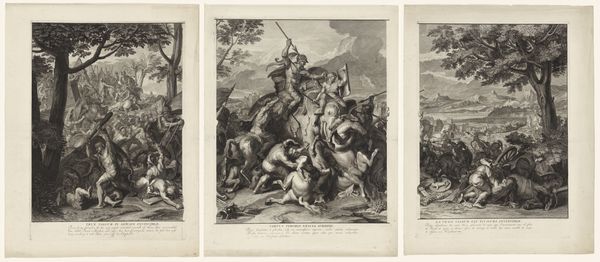 Daniel Nikolaus Chodowiecki created this print, "Huon de Bordeaux en Gérasme in gevecht met de Arabieren", where we see a scene of conflict, dominated by the figure of a knight amidst a chaotic battle. The cross emblazoned on the knight’s shield is a symbol of his faith, of divine protection, as well as his allegiance in this clash. This emblem reverberates through history, echoing the crusader battles of conquest, the pursuit of the Holy Grail, and the timeless battle between good and evil. We see this motif echoed in the modern day, in national flags and emblems of service. From the medieval Crusades to modern interpretations, the cross's symbolic power lies in its evocation of sacrifice, redemption, and moral conviction. The chaos of battle portrayed here speaks to a deeper psychological truth about humanity’s collective memory, the ceaseless struggle between order and chaos, civilization and barbarism, that continues to play out across the ages. This visual language appeals to our deepest subconscious, stirring primal emotions and connecting us to the experiences of those who came before.
