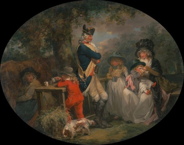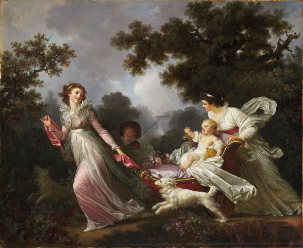 Editor: Here we have what appears to be Jean-Antoine Watteau's "Fete Champetre," its date unknown, created using gouache. It’s… charming, almost dizzying in its busyness. Everyone’s so elegantly posed, but their faces are obscured. What do you make of it all? Curator: Ah, yes, a Watteau! More of a whisper than a shout, wouldn't you agree? He was all about capturing the ephemeral nature of joy, a sort of poignant lightness of being, if you will. These fêtes galantes… they were daydreams on canvas. Tell me, do you sense a touch of melancholy beneath the surface of the revelry? It's almost as if these figures know that the music will fade, the wine will run dry, and they'll return to their gilded cages. Editor: Melancholy? Hmm, I was so caught up in trying to decipher the groupings. Is that woman on the horse flirting? Or just… escaping? Curator: Both, perhaps! Watteau never spells it out for us, does he? He gives us these suggestive scenes, full of coded glances and fleeting gestures, and leaves us to fill in the blanks. To me, that horse isn't just a horse; it's a symbol of freedom, of the untamed spirit that longs to break free from societal constraints. Isn't it glorious how something that looks airy and simple can hide all this richness? What about the hazy quality to it? Almost impressionistic, would you agree? Editor: It’s surprising actually. Almost unfinished in places, maybe intentionally. I assumed that was later with the Impressionists. Now I get why they say he's an influence. It’s a complex simplicity, I suppose. Curator: Exactly! That’s Watteau’s genius. He hints rather than tells. A true magician. Thanks for pointing out the hazy brushwork. I never tire of looking at it.
