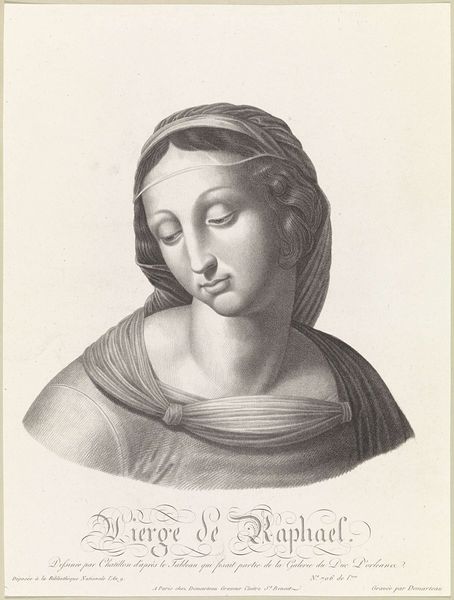 Editor: This is a drawing by Jan de Bisschop from around 1666 to 1671, titled "Antique Bust of a Woman." It’s made using engraving, giving it this very precise, linear quality. There’s a stillness to her, almost a sadness. What captures your eye when you look at this work? Curator: Well, beyond the superb skill in rendering the textures of skin and fabric with just line, I'm struck by the artist’s reverence for the classical. It’s as if he's reaching across centuries to connect with a beauty he sees as timeless. Notice how the light catches the curves of her face. What do you feel looking into her eyes? Do you think she embodies something bigger? Editor: I hadn’t really considered it that way! There is something really noble and elegant to her expression. A sense of timeless beauty as you said. Curator: Indeed. In his time, classical antiquity represented a high point of civilization, a source of inspiration and moral authority. De Bisschop, by rendering this bust, isn’t just copying; he’s engaging in a dialogue, interpreting the past for his present, and for our future too, no? Is it perhaps slightly too romantic a vision? I am always open to critique. Editor: It could be romanticized, but there's also something about the simplicity of the lines that keeps it grounded. It is more simple that it would be expected, I think that maybe, even involuntarly, this give to the face a "touch". Curator: Ah, that touch! Beautifully put! Each mark on the page is both deliberate and, strangely, intimate. You sense the artist's hand, his breath, in the act of creation, preserving a fragment of a long lost memory in the here and now. The touch reveals a lot... Editor: I never thought about a drawing as so intimate! I'll definitely be looking at drawings in a whole new light now. Thanks. Curator: The pleasure was all mine. Remember that beauty, and the feeling the drawings transmit. And question, challenge and reflect as often as you can!