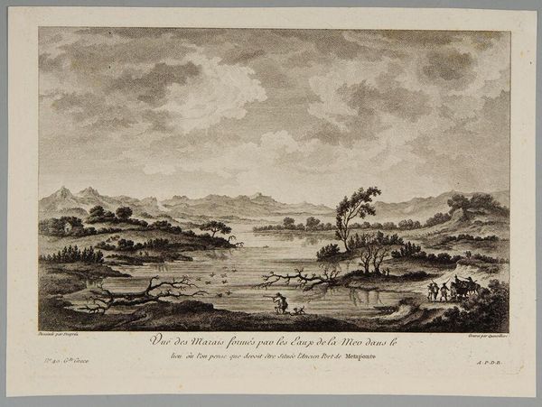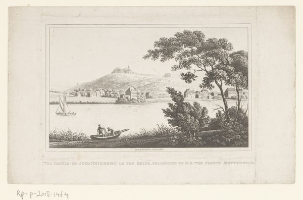 Curator: Gosh, it reminds me of those old postcards, doesn’t it? Something about the delicate lines and the monochrome gives it that vintage charm. It's almost as if the paper itself holds stories. Editor: Indeed. What we're looking at is "Landscape with a View of Sebins on the Danube," created between 1625 and 1677 by Wenceslaus Hollar. Housed here at the Rijksmuseum, it’s a beautiful example of Baroque landscape printmaking. Curator: Baroque landscapes, to me, always have this underlying drama, even in stillness. Look at how the little boat cuts through the vast expanse of water—you immediately get a sense of the world being larger than you are. But, it feels kind of intimate. Editor: That sense of scale is certainly intended. Hollar was working within a burgeoning print market. Views like this, of castles and towns, fed a desire for topographical accuracy but also a hunger for experiencing far-off places through imagery. The cityscape theme satisfied both needs, a public role for art linked to the political power it depicted. Curator: Do you think Hollar was aiming for an 'objective' rendering, or something more poetic? The way the light dances on the water, that seems so full of feeling for me, despite being quite graphic. Editor: I think both. Hollar had the skill to be objective, capturing details, but it was ultimately tied to a system that promoted certain idealized views of cities and power. That picturesque composition is quite intentional, and he created various prints showing similar settings. It speaks volumes about the public's aspiration to see these majestic places. Curator: It really speaks to me about longing for escape. Imagine catching that boat out of town with no responsibilities. What kind of social undercurrent was pushing and pulling in 17th century society? Was there a sense of longing to escape? I wish I had a tiny boat like that. Editor: Without a doubt. Hollar worked during a time of tremendous social and political change. Landscape imagery became increasingly tied to national identity and expressions of power. Prints like these were instrumental in creating a shared sense of place, reinforcing ideas about nationhood. Curator: It gives one pause about how deeply imagery impacts and is impactful to social and personal consciousness, doesn’t it? Editor: It really does. Something so delicate can tell us so much about how the world has changed – and how it hasn't.