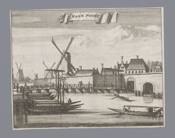 Curator: This is "Gezicht op de Raampoort te Amsterdam," or "View of the Raampoort in Amsterdam," an engraving that likely dates between 1710 and 1766. It is currently held in the Rijksmuseum. Editor: It possesses a curious stillness. The arrangement of windmills, structures, and figures on boats creates a compelling pattern, but there's a certain coldness about the line work; an emotional distance between the scene and the viewer. Curator: I'd argue that emotional distance stems from its function. As an engraving, it prioritizes clarity of form and structural detail, lending it an objective rather than subjective quality. Consider how the cross-hatching defines volume while remaining distinctly graphic. The tonal range is deliberately restrained. Editor: That's true, the very Dutchness of the subject carries potent symbolism. Waterways signify commerce, while the windmills stand for ingenuity and mastery of the elements. It's as if we're observing an idealised vision of civic pride and prosperity. It’s a celebration of Dutch identity itself. Curator: Precisely! Note also the layering. The image recedes in defined planes—foreground, middle ground, background—organized via strategic deployment of perspectival lines. These contribute to that formal, structured aesthetic. This meticulous construction enhances its legibility and aligns with Dutch Golden Age principles. Editor: I find myself drawn to those minute figures populating the scene; their smallness against the industrial backdrop underscores a particular kind of human experience amid progress. Their presence, rendered in minimal strokes, speaks volumes about human endeavors set against broader, transformative change. Curator: Yes, it's in these finely etched figures and the interplay of line that the image attains structural integrity, mirroring a carefully balanced and prosperous society. Editor: Indeed. Together, they build an image far exceeding the sum of its individual symbols. Thank you.