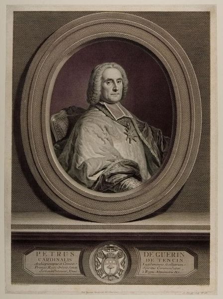Curator: This is "Portret van Pierre Guérin de Tencin," a neoclassical engraving made by Johann Georg Wille between 1725 and 1808. Notice how Wille employs a rigorously controlled line, creating a portrait of both power and restrained elegance. Editor: The first thing that strikes me is the medium. The act of engraving demands patience. What does it mean to painstakingly transfer someone’s likeness onto a metal plate with all its implications for labor and reproduction? Curator: That’s insightful. Let's consider the composition, then. The oval frame lends a classicizing air. The subject, identified by inscriptions, is situated firmly within this constructed space. See how Wille models form through meticulous cross-hatching, the light gently catching the sitter's face. It exudes control. Editor: I can see the control. Engraving multiplies and disseminates; this cardinal is becoming reproducible! The print material’s potential for social levelling contrasts his very lofty hierarchical position in society. Curator: Indeed, printmaking had quite a political charge, it seems, if one looks beneath the veneer of power. Yet Wille’s technical mastery gives this artwork a visual clarity, making it easily legible and powerful in conveying authority. The lines all converge to convey a sense of resolute intellect. Editor: The scale also affects how this authority disseminates. What effect does the smallness of the print – something easily shared – have on the perception and material movement of power here? How might it challenge the idea of singular authorship? Curator: Considering how Wille painstakingly recreated texture with just line and negative space, perhaps authorship remains key? There is immense effort on display, especially with its formal conventions conforming to academic artistic values of the era. Editor: Yet academic standards and modes of reproduction meet in a complex relationship. Thanks to this work, I’m rethinking what it means to labor making multiples. Curator: It gives one a fresh perspective on both form and making. Editor: Yes, together, the artistic intention and material result can reveal how intertwined they truly are.