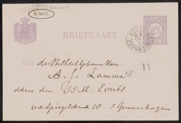 Curator: This postcard, possibly from between 1890 and 1892, is titled “Briefkaart aan Philip Zilcken,” translating to “Postcard to Philip Zilcken." It appears to be ink on paper. Editor: It feels intimate, almost ghostly. The faint lavender ink of the printed text and the darker grey script seem to speak of a past era. Curator: Exactly! Correspondence like this tells us so much about artistic networks and cultural exchange at the time. It’s more than just a message; it's a snapshot of the Dutch art scene of that period. Sending work via postcard also demonstrates a perceived accessibility that is tied to institutional networks for emerging artists, as Philip Zilcken was at the time. Editor: What stands out to me is how the imagery of postal ephemera is both functional and highly symbolic. The Dutch crest with the lion symbolizes national identity and power, juxtaposed with the humble purpose of a brief message between colleagues, and demonstrates a sense of order over an otherwise messy exchange of art and ideas. Curator: True. It illustrates how something as simple as a postcard could become a marker of belonging and identity. And sending from the Hague further indicates the institutional power dynamics at play in supporting particular artists. Editor: And look at the address – meticulously lettered, almost like a piece of calligraphy in itself. It imbues this small object with an emotional gravity – conveying a connection that transcends mere information. It makes me wonder what was so pressing at that moment for the parties involved to exchange. Curator: The stamp provides tangible evidence of its journey and the social context of art in the late 19th century. Think about the act of physically writing, addressing, stamping and mailing, particularly among individuals who circulated and upheld symbolic power, wealth, and a very curated identity. Editor: Examining these layers makes the card more than just old paper and ink. We see a bridge between individuals and their ambitions across time. Curator: I agree. A tangible glimpse into history.