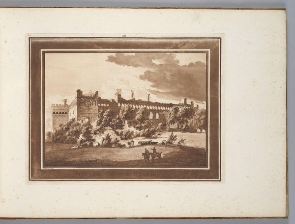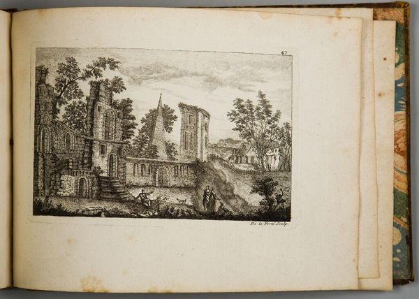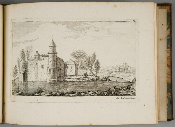 Curator: This is a fascinating etching, "Double-Bridged Manor House with Foreground Fishermen" by Denis-Pierre-Jean Papillon de la Ferté. Editor: It has an almost dreamlike quality. The detailed architecture juxtaposed with the serene water creates a powerful stillness. Curator: Absolutely. The bridges themselves are potent symbols. They represent connection, but also access and control, particularly in the context of the manor house. The waterways were the original highways. Editor: The figures of the fishermen in the foreground are visually compelling. Fishing connects to sustenance, patience, and a direct engagement with nature, placing them in stark contrast to the implied power of the Manor. Curator: Yes, and their presence prompts us to consider class dynamics of the time. Who has access to resources, to leisure, to land ownership? Editor: I agree. The piece invites us to reflect on the layered meanings embedded within these seemingly simple scenes. Curator: Indeed, a blend of power and everyday existence that history continues to echo.