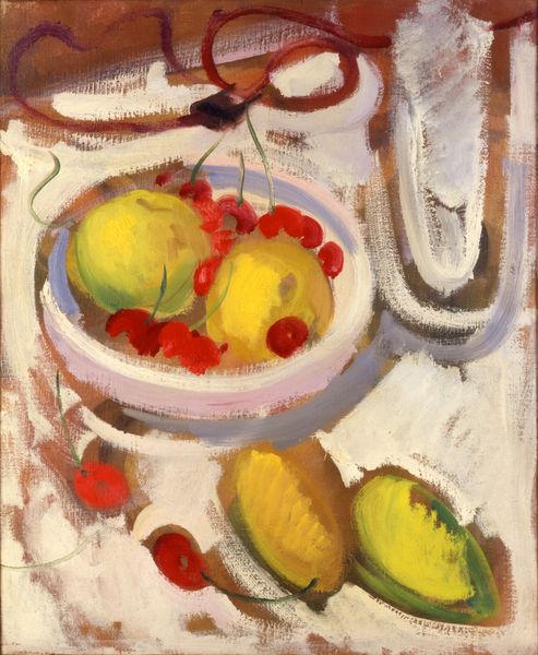 Editor: Here we have August Macke’s “Apples and Lemons,” created around 1909 or 1910. It's a pastel drawing on paper, currently at the Städel Museum. It's got this soft, almost dreamlike quality. What's your take on it? Curator: Dreamlike is a good starting point. I think this piece can be read through the lens of early 20th-century anxieties surrounding industrialization and the changing roles of women in society. The fruit, domestic and traditionally feminine symbols, are rendered in a style that almost dissolves their forms, suggesting a disruption of the familiar. How does this pastel medium inform the narrative? Editor: It's delicate, not bold like oils could be. Almost fleeting? Curator: Exactly. Macke's choice of pastel becomes crucial. Consider that pastel, often associated with 'feminine' artistry and amateurism, is here employed to depict a subject – fruit – traditionally aligned with domesticity. Is this merely an exercise in aesthetics, or is Macke making a quiet commentary on the perceived limitations placed upon both women and artistic mediums during his time? Does it perhaps signal his wish to embrace alternate approaches to creation? Editor: That makes me think about how expressionism challenged traditional artistic constraints. So, he might be challenging social constraints too? Curator: Precisely. The Expressionists sought to disrupt academic norms in favour of raw, emotional expression. What if we understand Macke's blurred lines and unconventional color palette as a way to express disillusionment with rigid societal expectations, similar to how female artists felt sidelined? Editor: So, the seemingly simple still life opens up into a commentary about gender and art… I hadn’t considered that before! Curator: Art is often about asking these difficult questions. Editor: That's definitely given me a fresh perspective, making me think about art as a form of societal reflection!