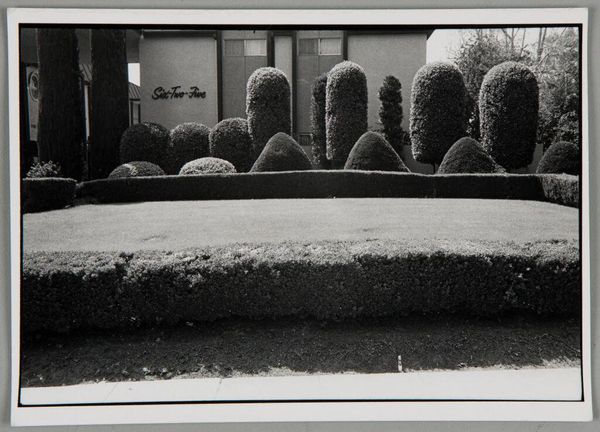 Curator: We’re looking at Ivor Abrahams' "Privacy Plots III: Suburban Hedge," held in the Tate Collections. Editor: It's immediately striking—a solid, almost imposing green hedge dominates the foreground. Curator: Abrahams often explored the idealized suburban landscape in his works. The hedge here acts as both barrier and a decorative element, reflecting societal obsessions with property and image. Editor: The texture is fascinating, a dense, uniform block of green. Then there’s the contrast with the softer, almost dreamlike, rendering of the house and flowers behind. Curator: Yes, the work speaks to the constructed nature of privacy and beauty in suburbia, highlighting the artificiality in these curated outdoor spaces. Editor: It feels so controlled, almost unsettling in its perfection. Curator: Exactly, it is this tension that makes it such an insightful commentary. Editor: A thought-provoking piece, indeed.