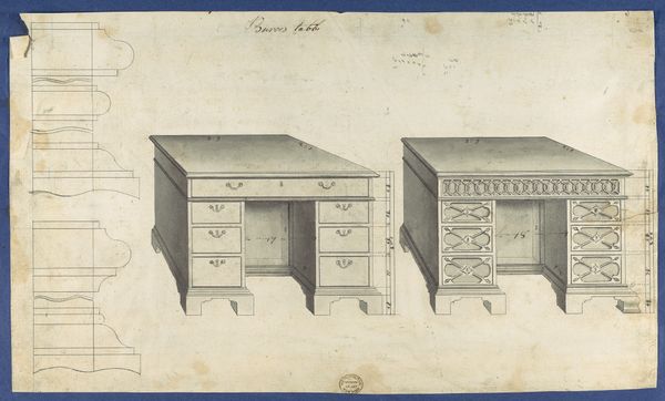 This is Thomas Chippendale's "Cabinet, from Chippendale Drawings, Vol. II," an ink and watercolor drawing now held at the Metropolitan Museum of Art. Chippendale, a leading furniture designer in 18th-century England, was known for blending various styles, including Gothic, Rococo, and Chinese influences, reflecting the era's fascination with the exotic and the global reach of British trade. This design presents a cabinet elevated on a stand, its clean lines and geometric patterns a nod to the period’s evolving aesthetic tastes. The very concept of a cabinet is deeply tied to class and gender. Historically, cabinets were status symbols, displaying wealth and taste, often managed by women as keepers of the household's valuables and personal items. Chippendale’s designs democratized high-end furniture through his pattern books, allowing a wider audience to access fashionable designs. Yet, it also speaks to the complex dynamics of labor and consumption in a colonial context, where the raw materials and production processes often relied on exploitation and unequal trade relationships.