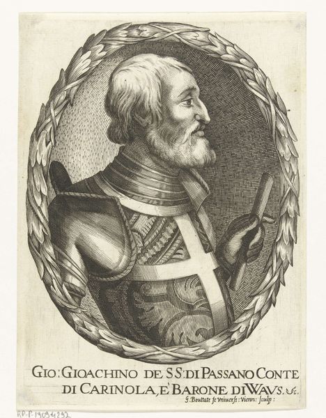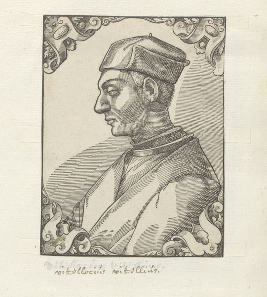 Editor: This is a portrait of Camillus Vitellus, an engraving from somewhere between 1549 and 1575, attributed to an anonymous artist. The figure's stern profile and heavy armor give the work a formal, almost stoic quality. What strikes you most about its visual qualities? Curator: It's fascinating how the artist used line to create form and texture. Note the density of lines used to depict the armor versus the relative sparseness in the face, creating a subtle hierarchy. How does that formal tension inform the work? Editor: That's interesting! So, the difference in line density draws your eye, telling you what is most important. Curator: Precisely! The subject's face, while finely rendered, emerges from a calculated arrangement of form and tone. Consider the curved lines used to suggest the contours of his cheek against the contrasting linear strokes describing the armor. The structural dynamic offers an arresting juxtaposition. Editor: I hadn't thought about it that way. So the artist’s careful juxtaposition of textures emphasizes the subject's humanity against the rigidity of warfare? Curator: It is not outside the realm of possibilities. The decorative frame is also crucial: observe how it both contains and amplifies the portrait, creating a play between the figure and his environment. Without such ornamentation, I imagine that this would simply be an antiquated likeness of a gentleman soldier. What are your thoughts? Editor: That contrast creates depth. I guess it invites us to consider his inner thoughts amidst his public image. The balance of line and framing truly shifts my perception of the work. Curator: Indeed. Appreciating such careful construction changes one’s perspective.