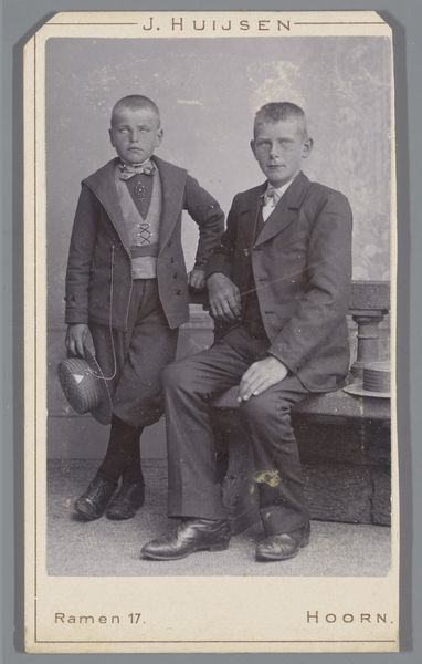 Curator: Henri Bickhoff created this photographic portrait, "Portret van drie onbekende jonge mannen," sometime between 1890 and 1930. It's quite captivating, don't you think? Editor: Yes, there's a remarkable stoicism about it. The subdued sepia tones and the rigid postures suggest a very particular social performance being documented here. You almost feel the weight of their coats, their collars, the constraints of societal expectation! Curator: Exactly. I'm intrigued by the physical making of it. Photography at that time demanded a degree of craft in preparing the plates, developing the image, and ultimately producing prints. Each step involves physical labor and a dialogue with the materials at hand. I would be interested to know what type of emulsion was used here, and whether Bickhoff was manipulating the print itself for tonal effect. Editor: Looking at it through a historical lens, I can’t help but think about the evolving role of photography in shaping social identities. Studio portraits like this became increasingly accessible to the middle classes, enabling them to visually construct and disseminate a public image. Note the location imprinted on the bottom - "H. Bickhoff, Spui, Amsterdam" indicating a growing culture around urban photography studios. Curator: I'm drawn to the specific construction of each of their outfits. The fabric, cut, and finish reflect their status and the prevailing social codes. Who wove the cloth? What were their working conditions like? This image presents layers of manufacturing labor before it even arrived in the studio. Editor: True, but their careful selection and curation were central to the construction of social identity during that time. The fashion clearly signals their affiliation to particular bourgeois groups, echoing evolving political norms, artistic movements, and emergent consumer behaviors. It shows the image very intentionally staged for wider social consumption. Curator: Ultimately, photography is a means of material and social reproduction. Editor: Indeed. "Portret van drie onbekende jonge mannen" functions on both material and public historical planes. Fascinating!