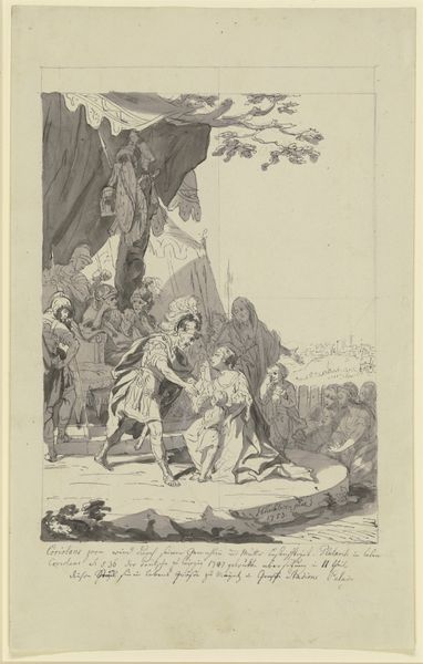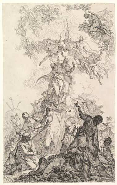 Editor: This is an engraving from 1755 by Marcus Tuscher, created as an illustration for Frederik Lodvig Norden’s "Voyage d'Egypte et de Nubie." It’s a crowded scene, almost theatrical in its arrangement of figures and symbols, but also kind of perplexing. How do you interpret this work? Curator: This piece encapsulates the burgeoning European fascination with Egypt in the mid-18th century, filtered through a Neoclassical lens. Notice the figures posed like statues, and the architectural elements mimicking classical forms – yet juxtaposed with overtly Egyptian motifs. Editor: Yes, I see the pyramids and hieroglyphs, but then there’s a figure riding a crocodile! It feels like a combination of accurate depiction and fantastical projection. Curator: Precisely! The crocodile, a symbol of ancient Egypt, is subverted here, acting as a beast of burden. Ask yourself what that positioning signifies within a European worldview. What inherent biases are present when representing a "vanquished" culture? Editor: It’s like they're trying to capture the essence of Egypt, but from a very Eurocentric point of view, almost like an exotic trophy. Curator: Indeed. The radiant figure, crowned, commanding respect - how does she stand in relation to those around her, seemingly crushed under the weight of antiquity? Editor: I guess I never considered how much the artist's own cultural context would affect his rendering of another culture's history. Curator: Visual language carries embedded cultural memory. Examining it closely unveils these hidden dimensions, reminding us that what we see is always mediated by a particular perspective. Editor: So it is less about "truth" and more about a specific interpretation through symbols. I’ll certainly look at these illustrations in a different light now!