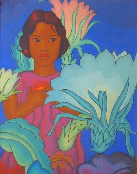 Arman Manookian painted "Polynesian Woman and Tiki" in Hawaii in the late 1920s, a time of increasing tourism and cultural exchange. The painting presents a local woman alongside a traditional Tiki statue, surrounded by lush foliage. Manookian's work is interesting because it brings together elements of both Polynesian culture and Western artistic styles. The Tiki, a symbol of ancestral power, is juxtaposed with the woman's contemplative pose, possibly reflecting the complex relationship between tradition and modernity in Hawaii at the time. The soft color palette and flattened perspective also reflect the influence of European modernism. Understanding this painting requires us to consider its historical context. Examining tourist ephemera from this time, like travel brochures, reveals how Hawaiian culture was marketed to outsiders, sometimes reinforcing stereotypes. Manookian's image invites us to reflect on how local identity is shaped by both internal traditions and external perceptions.