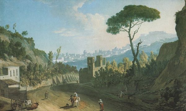 Editor: This is David Cox's "Carthage. Aeneas and Achates," made in 1825 with watercolor. The buildings in the distant city seem so sharply defined in contrast to the softness of the land. How do you interpret this work, looking at it through your particular lens? Curator: I notice the tension between the meticulous rendering of Carthage and the looser, more expressive brushwork in the foreground. Consider the socio-economic context: watercolor was becoming more accessible. Cox was likely producing these scenes for a burgeoning middle class interested in travel and the classics, but perhaps without the means for oil paintings or actual travel. Editor: So, the materials and the style point towards a specific market and accessibility? Curator: Exactly. Think about the paper itself, likely mass-produced, versus vellum, a traditional and more expensive support. Cox is utilizing a cheaper support in combination with a burgeoning landscape watercolour tradition. What is suggested when considering it was completed 30 years after Britain outlawed the Slave Trade and a year prior to The Gambia becoming a British Colony? Editor: So the subject becomes fraught. While it appears an idyll of an ancient city, it’s inextricably tied to a period of colonial expansion, a market that demands romanticised landscapes complicit in that system. Curator: Precisely. The materials and techniques speak volumes about the painting's place in the social fabric. Also, where does the material – pigment, the paper, the brush used – originate, and whose labor was it produced by? It challenges us to look beyond just the surface beauty, doesn't it? Editor: It really does. I hadn't thought about the materials themselves having a story to tell about the world in which it was made. It makes me rethink what I thought I knew about landscape paintings in general! Curator: Excellent! That critical awareness of materials and context is key. We move beyond just aesthetics.