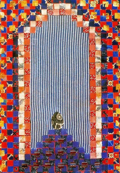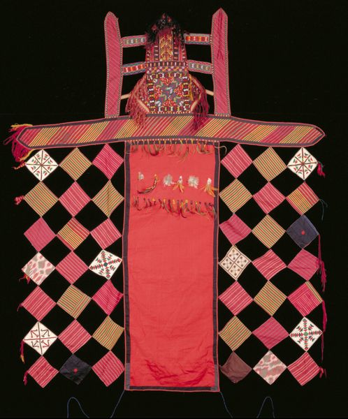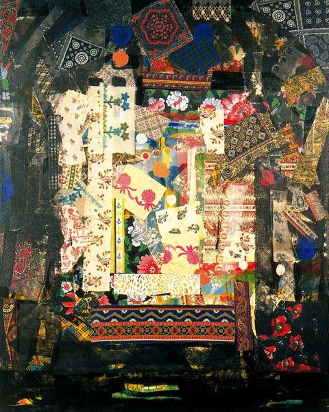 Editor: Here we have Miriam Schapiro’s "Época (Paul Gauguin and Me)" from 1975, a mixed-media collage incorporating fabric and textile elements. It feels simultaneously celebratory and like a deconstruction. What are your initial thoughts when you see this piece? Curator: It strikes me as a bold reclamation of artistic space. Schapiro is deliberately inserting herself into the art historical narrative, specifically challenging the male gaze so prominent in figures like Gauguin. Do you see how she's using appropriation not as simple mimicry, but as a tool for empowerment? Editor: I hadn't considered it that way, I just saw that she put herself alongside Paul Gauguin. Can you explain how this work speaks to broader feminist art movements? Curator: This piece embodies the core tenets of feminist art. Schapiro uses traditionally "feminine" materials like textiles and patterned fabrics to elevate crafts often dismissed as domestic labor to the realm of high art. The inclusion of “Me” isn't just biographical, it’s a deliberate act of rewriting art history to include women's perspectives. Notice how she challenges traditional notions of abstraction with gothic overtones to explore personal identity. How do you feel about this technique and its power to rewrite art history? Editor: So it's like she's actively challenging established hierarchies and narratives by putting herself into conversation with a canonical, male artist using traditionally feminized craft techniques? That is fascinating! I'm now looking at this artwork with an entirely new perspective. Curator: Exactly! The work sparks a dialogue between art history, gender, identity, and materials, disrupting conventional ideas of what art can be. Editor: I appreciate the new perspective. This opens so many conversations about who gets to be remembered and how art can rewrite the narrative. Curator: Absolutely, this piece exemplifies art’s ability to instigate change.