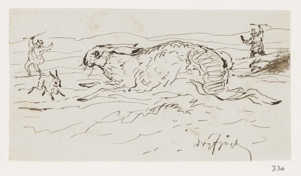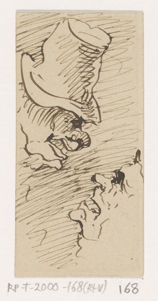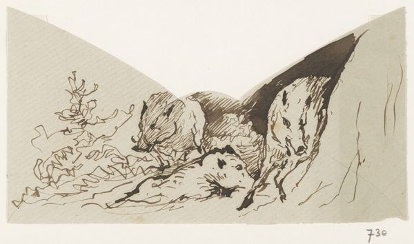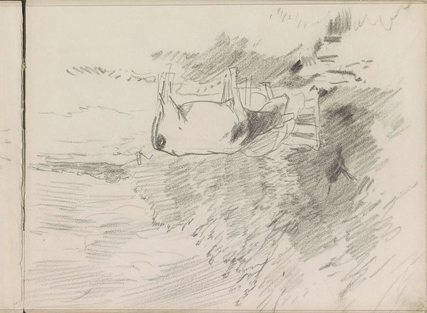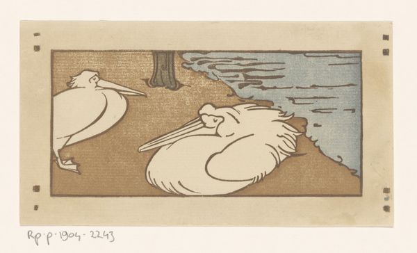Curator: This pen and pencil drawing is entitled "Twee pelikanen aan de waterkant," which translates to "Two Pelicans at the Waterside." It's attributed to Reinier Willem Petrus de Vries, created sometime between 1884 and 1952. Editor: Immediately, I’m struck by the stillness and quietude of the scene. The soft pencil work and subdued composition evokes a tranquil atmosphere. Curator: I agree. The work evokes a moment of quiet observation. Given that the artist was active during a period marked by significant colonial expansion and exploitation of natural resources, this quiet depiction prompts us to consider the portrayal of animals. Editor: In what ways? I am wondering how this portrayal relates to broader power dynamics inherent to the representation of animals in art. It's easy to idealize nature, but not always easy to reckon with how human actions affect vulnerable animals and ecological systems. Curator: Precisely! Representations of nature aren't neutral. Examining artistic trends—specifically Realism here—through ecocritical and postcolonial lenses illuminates how even seemingly benign depictions contribute to constructing ideological justifications of dominion over both human and non-human subjects. This pelican rendering fits that context well. Editor: Right. Even the artistic materials contribute, paper and graphite feel humble. What do you think, would they signal that the artist wanted to render a naturalist's scene? It evokes a field study or a naturalist's notebook, less focused on imposing grand narratives and more on subtle observation of nature. Curator: It certainly supports that theory, as does his choice of a quick drawing rather than a lavish painting to create more humble representation. In relation to similar academic works of the time, this could suggest some form of critical dialogue towards a dominant style. Editor: I leave this drawing appreciating it anew for what it reveals to me, the art history lessons being told through it!