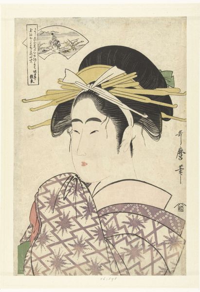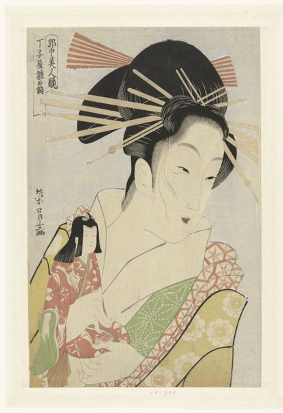 Editor: This is *The courtesan Hinazuru of the Chojiya* created between 1790 and 1823 by Ichirakutei Eisui. It’s a Japanese woodblock print and it strikes me as both elegant and melancholic. What do you see in this piece? Curator: I see a potent commentary on the societal roles imposed on women in Edo-period Japan. Ukiyo-e prints, like this one, weren't just pretty pictures; they actively participated in the construction of celebrity and desire. Here, Hinazuru is meticulously styled, her beauty commodified for consumption. What’s missing? Agency. Her downward gaze and concealed expression subtly hint at the constraints of her profession. Editor: So, you are suggesting it's more than just a portrait of a beautiful woman? Curator: Exactly. Consider how the print was distributed. These weren't displayed in galleries, they were widely circulated. They shaped public perceptions of beauty, status, and the complex realities of courtesans' lives. Hinazuru's identity is caught between personal expression and societal expectation. Look at the patterns on her kimono – symbols with encoded meanings, yet ultimately decorative. What do they tell us about the relationship between appearance and reality? Editor: That's a compelling way to view it, thinking about the role of the image in society at the time. It adds a whole new layer. Curator: Indeed. And understanding that social context empowers us to challenge simplistic notions of beauty and unpack the complexities of gender and class in art. Editor: I hadn't thought about it that deeply. Thanks, I'll definitely look at other Ukiyo-e prints with this in mind! Curator: My pleasure! It’s all about peeling back the layers and finding those stories within.