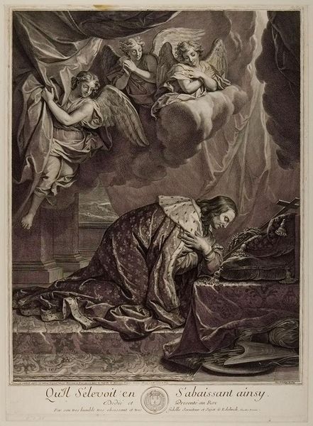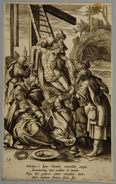 Curator: This is Jean Baptiste Charles Carbonneau's "Descent From the Cross," housed here at the Harvard Art Museums. Editor: The texture is so rich it almost feels sculptural, even though it's a print. It really captures that somber, heavy moment. Curator: Absolutely, it's a powerful depiction rooted in religious and social dynamics. Think of the power structures embedded within this scene, the vulnerability of Christ, and the performative grief of the mourners. Editor: It’s interesting how Carbonneau makes the act of lowering Christ seem almost frantic, everyone reaching, holding... There's a raw human desperation in the composition. It’s haunting. Curator: And look at the basin in the foreground, a symbol of ritual cleansing but also a stark reminder of the body's fragility and the intersection of faith and mortality. Editor: I keep coming back to the emotional weight. It's a testament to how art can amplify sorrow, making us feel something profound across centuries.