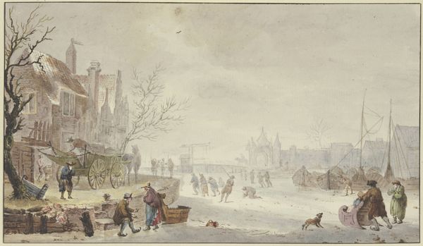 Curator: Ah, here we have "Wintergezicht met ijsvermaak," or "Winter Scene with Ice Skaters," a watercolor possibly from somewhere between 1716 and 1783, painted by Barbara Dietzsch. Editor: It's a lovely scene! The cool blues and grays give such a palpable sense of cold. You can almost feel the chill in the air, but it also seems so lively with the activity on the ice. Curator: Indeed. The scene reflects a cultural memory of Dutch winters as times for community and recreation. Winter landscapes were a popular genre, allowing for playful portrayals of everyday life, much like Bruegel a century before. Editor: Absolutely, it highlights how communities adapt and even thrive in challenging conditions. Seeing the figures engaged in leisure brings to mind how even harsh environments can foster a sense of belonging. This almost feels subversive; finding pleasure even when surrounded by barrenness. Curator: You touch on something critical. Note how the built environment—the fortified tower, the houses clustered near the frozen water—reinforces that sense of community, offering protection from the elements. The buildings themselves could almost be seen as symbols of shared endurance. Editor: And the watercolor medium, with its delicate washes, emphasizes the transient nature of the scene. It's a fleeting moment of joy captured in time. Does this artist also capture the disparities present even within that landscape? I am also curious about who had access to those leisurely skating spaces. Curator: These scenes rarely delve explicitly into socio-economic disparities, though art historians often highlight that such genre paintings are generally targeted at the wealthier merchant class who had leisure time and an interest in viewing idealized versions of themselves or their society. Still, there's a democratic spirit present, with diverse figures engaging in a shared activity, which offered a counterpoint to the more rigid social structures. Editor: I can see the communal appeal despite it being idealized, especially now. There is a certain comfort in these portrayals. Even beyond the figures, I find this notion expressed visually as well with the architectural construction against the atmospheric landscape. Curator: Well, observing and discussing artwork across centuries opens our eyes to aspects of life that may resonate despite temporal and cultural distances, which offers insight to how cultures and ideologies survive despite the elements and hardships. Editor: It makes me think about our current moment, where communal activities are framed so radically different in response to climate-altered and turbulent present-day, and it is interesting to ponder how visual records of pleasure can simultaneously highlight both the familiar and the rapidly disappearing.