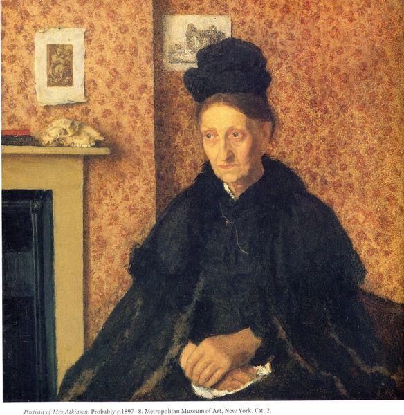 Curator: The overwhelming sensation this painting gives me is stillness. An acceptance, perhaps even. Editor: We're standing before Paula Modersohn-Becker's "Old Woman with Handkerchief," painted in 1903. It’s an oil painting, one that immediately strikes me with its raw, unflinching portrayal. Curator: Right. She's there, and you can see every wrinkle, every freckle, every hint of the life she's lived etched onto her face. I find that incredibly powerful and honest. Like there is nothing hidden about it. Editor: Precisely. Note the color palette: primarily earth tones. The figure emerges from a background of mottled greens and browns, all applied with thick, visible brushstrokes that emphasize the materiality of the paint itself. See how the light catches the sharp angles of her nose and brow? Curator: Oh, it's her hands, though, that pull me in every time. Clasped in her lap, holding a pale handkerchief. It gives such an air of introspection. Like she’s folded up with worries, or maybe that’s the weight of simply being present. Editor: They are the focal point, grounding her amidst the textured backdrop. Modersohn-Becker’s work, especially around this period, engaged with the formal strategies we now associate with early expressionism, simplifying forms and emphasizing emotional expression over realistic representation. Curator: She had such a distinctive way of turning inward to translate feelings into color, form and surface—before people even knew what those terms meant, for modern art, at least. Like here, she takes us straight into the heart of what this woman is feeling and her face becomes universal. It transcends the need for any frills, if that makes sense. Editor: Absolutely. The simplicity is key. Modersohn-Becker achieves so much with such an economical use of line and color, directing our gaze and imbuing this portrait with a profound sense of quiet dignity. Curator: I just keep wondering what she was thinking. Editor: That ambiguity is part of its strength, isn't it? We’re invited to complete the narrative, to bring our own experiences and interpretations to the encounter. Curator: You're right. Ultimately, I’m left with the quiet weight of being, I guess, the feeling that’s human experience simplified. Editor: A sentiment that resonates across time. A beautiful painting, isn’t it?