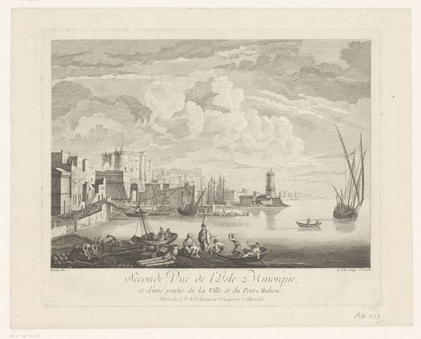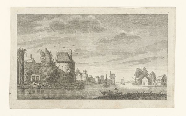 Curator: Andreas Flint created "Landskab" in 1789. It’s a landscape done as an etching. What are your immediate thoughts on this print? Editor: Oh, it's like stepping back in time. I can almost hear the water lapping against the stone walls. There’s a sort of romantic, melancholy air to the scene, a crumbling fortress…it’s a vibe. Curator: Indeed. The composition utilizes the body of water as a strong horizontal element, visually separating the architectural components from the sky above, achieving a striking balance. It makes for an interesting interplay of light and shadow across the various structures and foliage. The artist is a true observer of light here. Editor: I see what you mean about the light. But to me, it's about decay, too. Notice the ruined turret overtaken by greenery? There’s this sense of nature reclaiming what’s been built. Almost bittersweet. Curator: A pertinent point, it highlights a theme within Baroque landscape prints to show the transient nature of human achievements compared to the eternal power of nature. I wonder, did you note the detailed work of the people on boats or the way Andreas Flint structured the skyline? Editor: They're almost hidden. You almost have to hunt around to realize there’s a cityscape in the background beyond the big castle-thing up front. All those little boats! It makes you wonder about all the activity along the waterways during this period. I wonder what stories they carry? Curator: I am compelled to suggest it shows Flint’s mastery of etching; note how the fine lines create textures and forms. Semiotically, the juxtaposition of the ruins and the active waterway generates an eloquent narrative around the passage of time. Editor: It makes you want to slow down, appreciate these quiet scenes of everyday life. A kind of invitation into the artist’s moment. Curator: A quite insightful interpretation. Flint encourages, in essence, a dialogue between then and now by capturing a moment framed by its location. Editor: True. Well, it’s more than just technique and timeframe, it’s that quiet story humming underneath. That whisper of impermanence makes it special, I think. Curator: Very eloquently said. I hadn’t looked at it from such a touching angle previously.