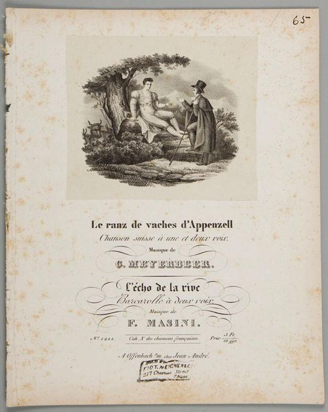 Curator: Before us we have Paulus Lauters' print titled "Omslag met twee kunstenaars buiten aan het werk onder een boom," created sometime between 1827 and 1851. It's currently held in the Rijksmuseum. Editor: The composition feels very ordered, despite depicting a scene en plein air. It exudes this… restrained energy. The grayscale doesn’t give away much, but the details in their work really stand out. Curator: It's a lithograph, part of a series meant as an instructional tool - "Principles of Landscape: Usage for Beginners. Drawn after nature," as the title states. The very process of lithography here implies an effort at mass production and distribution for pedagogical purposes. Editor: It seems incredibly exclusionary. The Romantic era idea that artistic genius emerges from a select few in leisurely landscapes ignores labor in the artistic profession. Curator: That’s an interesting perspective. I am curious to delve deeper into who had access to such printed material. Was it largely amateur middle class practitioners imitating professional approaches? Editor: Yes! Think about how access to education and leisure time intersected along class lines. These "beginners" likely belonged to a specific social stratum. Curator: I agree. We should also consider the context in which it was printed; its publishers, De Wasme-Pletycka in Brussels. Printing itself as an industry...it provides clues about both artistic dissemination and its economy. Editor: Looking closer, I can appreciate how Lauters tried to represent that artistic production by depicting artists in what seems like a pastoral idyll. There's an engagement with nature, for sure, but who got to engage with nature in that way? Curator: Lauters seemed particularly involved in lithography – we may consider the standardization of drawing through his engagement with reproductive graphic media. Editor: These artists under the tree may have been more about romantic idealism than any kind of accurate depiction of an actual artist's lived experience. This artwork sparks reflection of accessibility and privilege within the art world even then. Curator: Exactly! Understanding how such prints were conceived, created, and circulated, it can challenge ideas regarding romantic notions that have shaped art making since. Editor: This makes it even clearer that engaging art with a material awareness is essential for true progress.