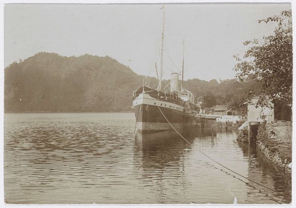Editor: This gelatin-silver print, titled "Uitmonding van de Batang Aron bij de Apenberg in Padang" by Christiaan Benjamin Nieuwenhuis, captures a serene scene with locals near a river. The overall feeling I get is one of quiet observation, almost anthropological. What strikes you most when you look at it? Curator: I see a careful arrangement of elements meant to evoke an idealized vision of life in Padang. The placement of the figures, the boats, even the animals—they're not merely documented, but carefully positioned. Consider how the small sailboat echoes a larger narrative, connecting this localized scene to the broader history of trade and colonial encounter. What do those visual echoes signify for you? Editor: I guess the sailboat represents the link to the wider world, but the rest of the image seems quite insular. Do you think it reflects the photographer's intent or maybe the constraints of the medium at the time? Curator: It’s both. Photography, especially then, could reinforce certain romantic or even paternalistic views. Nieuwenhuis isn't just recording; he’s also framing a narrative about the relationship between people and place, one tinged with the visual language of Orientalism. Look how the palm trees lean – do they seem welcoming or imposing? Editor: Now that you mention it, there's a definite sense of imposed order, even a stillness, despite the activity shown. So it's less about a faithful depiction and more about conveying an idea. Curator: Precisely. Images such as this become powerful cultural artifacts, encoding social and political relationships within their seemingly simple compositions. Think about how these kinds of images shaped European understanding and, conversely, how they impacted the self-perception of the people in Padang. Editor: That’s a great point; I hadn’t considered the reciprocal influence. This image is far more complex than I initially thought! Curator: Indeed! Every element, from the boats to the trees, carries a symbolic weight, revealing layers of cultural memory and colonial dynamics if you pay close attention.