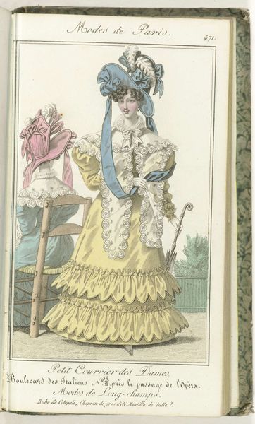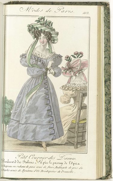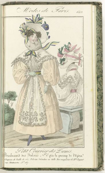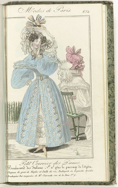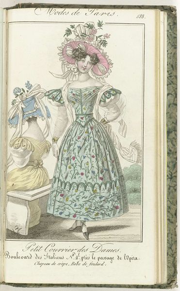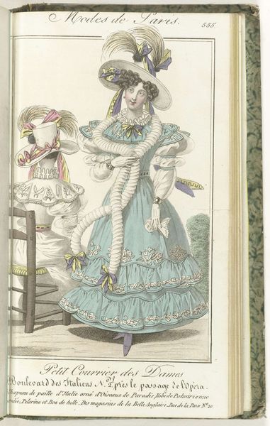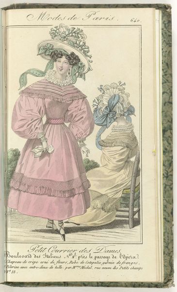 Curator: This engraving, "Petit Courrier des Dames, 31 mai 1828, No. 558", showcases a fashion plate from 1828. It's fascinating to consider how prints like this acted as early forms of advertising, shaping consumer desires and dictating social status through dress. What strikes you most about this image? Editor: I find the excessive ornamentation almost comical. The ruffles, bows, and puffy sleeves seem so impractical, yet they communicate a very specific ideal of femininity. It also makes me wonder about the labour involved. What does this print reveal about the materials and processes that went into creating these garments? Curator: Precisely. Consider the fabric, likely a lightweight cotton or linen given the reference to "guingan brodée" - embroidered gingham. Its accessibility, due to expanding colonial trade networks and industrial textile production, is crucial. However, the hand embroidery speaks to a different, slower pace of artisanal skill. How does the print itself – an engraving – play into the dissemination of these ideas? Editor: The engraving allows for mass production, meaning more people could see and potentially try to emulate these styles. But doesn't the detailed nature of the print also suggest a certain level of artistry and care in its creation? Curator: Indeed. It complicates our understanding of the "art versus craft" debate. The engraver, though reproducing a fashion ideal, uses skill and technique to elevate a commercial image. Are they an artist or artisan? The division becomes blurred when we consider their labor. What implications might the clothing trade have on gender roles in the early 19th century? Editor: It seems the fashion industry provided opportunities, even if limited, for women both as producers and consumers, reinforcing and challenging established gender norms at the same time. Curator: Exactly. By looking at the materials, production processes, and social circulation of this fashion plate, we gain a richer understanding of the complexities of gender, class, and consumption in 19th-century society. Editor: It's amazing how much information can be gleaned from a single fashion plate. It's far more than just pretty dresses!