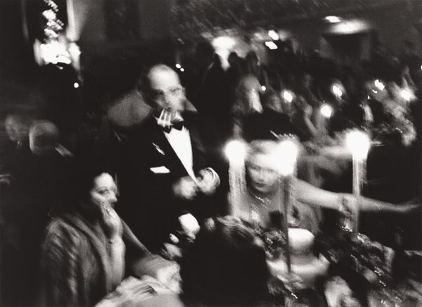 Curator: Robert Frank’s 1951 photograph, "Sideshow, Paris," offers us a glimpse into a small Parisian spectacle. What catches your eye first? Editor: The stark contrast. The deep shadows in the foreground swallowing the audience, juxtaposed with that almost blinding light illuminating the stage. It's immediately dramatic, theatrical. Curator: That’s a wonderful observation. Beyond the visual, the subject is itself pregnant with cultural symbols. Sideshows have always held a complex position in our collective consciousness—entertainment that skirts the edges of exploitation, often showcasing marginalized figures. The cut-out female forms, almost ghostly in the artificial light, what do they evoke for you? Editor: Those cut-outs… the light bleeds into their shapes, blurring their outlines. There’s a definite flattening, an objectification. It renders them less as individuals and more like… archetypes, perhaps. How might this resonate with broader societal views, then and now? Curator: The figure on the right, the man with the dark suit and dark round glasses, stands between reality and artifice. He seems to be an operator, in some senses a ringmaster who, as showman and master of ceremony, mediates the relationship with the public. Is the photograph as much about performance as it is about viewership? Editor: Yes, this brings forward what strikes me most: the ambiguous role of spectatorship itself. We’re implicated, aren't we? Our view mimics the blurry forms in the seats, inviting us to consider what we seek in these kinds of displays. It raises questions about our voyeurism, the gaze, the other. Curator: A very astute reading, indeed. Frank, of course, was known for his ability to capture fleeting, often uncomfortable, moments. "Sideshow, Paris" presents an almost timeless representation of performance and perception, light and darkness, authenticity and fabrication. Editor: It seems what began as simply light versus shadow leads us down a winding path of reflection about those ever present tensions. Thanks to the way the composition guides us, it feels relevant still.