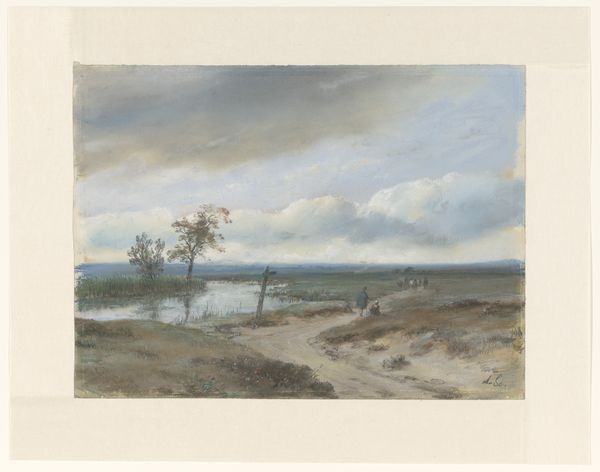 Curator: Oh, this watercolor just hums with quiet melancholy, doesn’t it? It’s entitled "Landscape with a Cottage" by Théophile de Bock. He probably made it sometime between 1865 and 1904. Editor: My first impression is overwhelmingly…grey. Oppressive, even. Look at those clouds churning overhead and the murky foreground. There’s an almost suffocating feeling of enclosure despite being a landscape. Curator: Exactly! He paints the air itself like a heavy cloak. The cottage is almost consumed by the landscape; this is nature dwarfing humanity, not a cozy idyll. Editor: I'd say it's a loaded image. Consider how land ownership and access to resources were—and continue to be—powerful markers of privilege and social mobility. This humble dwelling nestled within a seemingly indifferent landscape makes you question ideas about home and belonging. Is this about vulnerability and marginalization? Curator: I get that read! Though for me, there’s something deeply peaceful in accepting your place in the natural order of things, in observing how the light touches a simple scene. Editor: Peaceful, or resigned? Are the figures outside the cottage presented with agency, or are they simply present, framed by this imposing natural scene? It begs the question, who does the land truly serve in this period of growing urbanization? Curator: What’s striking, I think, is de Bock’s commitment to observing shifting light conditions. It's a work completed ‘en plein air,’ trying to capture the transient moment, the emotional impression. A beautiful attempt, whether bleak or not. Editor: Absolutely, its historical context demands that we go deeper than aesthetic appreciation. It's more than just light and shadow—it reflects the anxieties and socio-economic realities that defined this era. Curator: Perhaps that’s the beauty of it; that even within the artist’s intent to render something ‘real,’ it holds space for our interpretation and for dialogues about society. Editor: Precisely, seeing art as an invitation, not an instruction manual. It calls for continuous questioning and analysis.