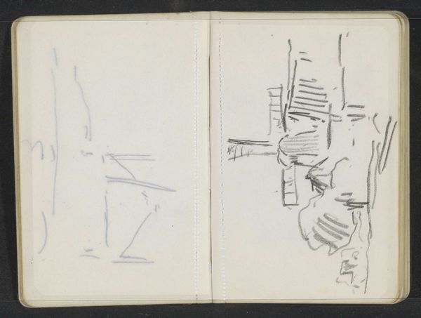 Curator: Looking at "Gezicht op een steeg," or "View of an Alley," from between 1880 and 1882, you can feel the city's quiet breath held in a fleeting sketch by George Hendrik Breitner, currently housed in the Rijksmuseum. Editor: My first thought is that it's delightfully…unfinished. Almost a whisper of a street. You can practically hear the echoes bouncing off the brick. Curator: Exactly. Breitner captures the essence of a fleeting moment using primarily pencil. The quick, almost scribbled lines give it this ephemeral quality. You feel like the scene could dissolve before your eyes. It’s impressionism at its most intimate, wouldn’t you say? Editor: Oh, certainly. Observe the stark contrast, the interplay of light and shadow. The architecture nearly bleeds into the sky. It emphasizes the towering nature of urban existence, but it’s also vaguely unsettling in its stark simplicity. Almost oppressive. Curator: I find it more inviting, actually. Like peering down a secret passage. I love how Breitner doesn’t offer a complete picture. It's more of a suggestion. What’s beyond those implied doorways? What secrets are these walls holding? It really plays with the viewer's imagination. Editor: That absence might be its greatest strength, prompting introspection of not only the setting itself, but of one’s role as an observer of intimate places. The sketch as a moment, crystallized for reflection. Curator: That's a lovely sentiment. It encapsulates why I think Breitner is so impactful—the man’s capturing a very fragile, impressionistic truth. A kind of hushed, grey day suspended in time. Editor: A perspective perfectly distilled, wouldn’t you agree? Something to linger with, I think.