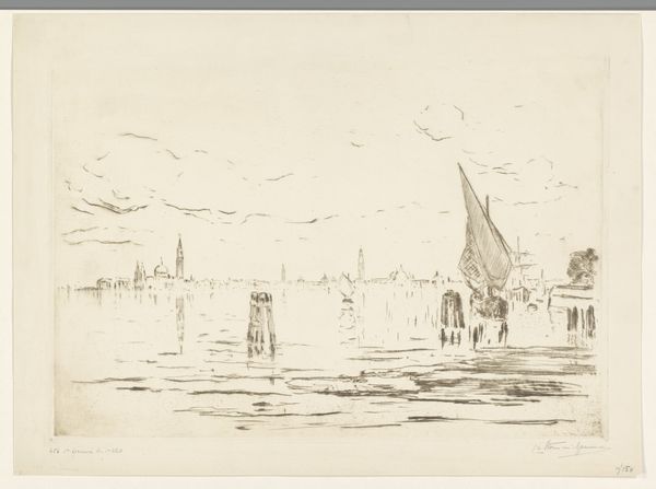 Editor: We’re looking at “Oude Kerk van Scheveningen, gezien vanaf het strand,” a pencil drawing on paper by Johannes Bosboom, created around 1873. It gives me a quiet feeling, almost like looking back into a simpler time. What strikes you most about it? Curator: It's interesting how Bosboom uses this almost casual sketch to present a very specific social scene. The Oude Kerk, or Old Church, was a central point in Scheveningen, but what’s the focus here? Is it faith, or the daily lives of the fisherfolk sketched in the foreground? Editor: It definitely feels more focused on the people. They seem busy with their nets, perhaps? Curator: Precisely. And note how the church, while present, isn't grand or imposing. This reflects a broader shift in the 19th century, where art moved away from solely religious or historical subjects and towards depicting everyday life, particularly of the working class. Consider also how the rise of Realism influences such a shift. Why depict only the elite when the real story lies with the populace? Editor: So, Bosboom isn't just drawing a pretty picture; he’s participating in a movement that re-values the common person? Curator: Exactly. And that choice, to portray Scheveningen and its people this way, highlights the changing socio-political landscape of the Netherlands at the time, one that valued the lives and experiences of the working class in a way that hadn't always been the case. The museum elevates such a depiction by placing this drawing in its collection. Editor: That's a fascinating perspective. I’ll definitely think about that the next time I look at art from this period. Curator: And perhaps consider what aspects of our own lives and social structure will be of interest to artists and institutions in the future.
