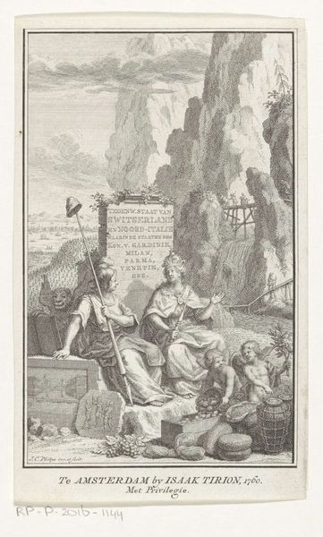 Jan Ruyter created this title page for the "Europische Mercurius" of 1734 using engraving. The composition is a complex allegorical scene teeming with figures and symbols, creating a dynamic visual experience. The arrangement of elements, from the central figure of Mercury to the surrounding characters and objects, suggests a deliberate construction of meaning. Look at how Ruyter used this crowded composition to convey the "Europische Mercurius" which served as a comprehensive chronicle of the year's political and cultural events across Europe. Mercury, known as the swift messenger of the gods, holding a quill and sitting atop a collection of papers, might be seen as a symbol for the written word and dissemination of knowledge. Consider the lion, a symbol for strength and courage, on the lower left contrasting with other symbolic figures and objects. Ruyter is engaging with the contemporary European context, which emphasized the power of the written word, and the importance of historical documentation and reflection. Note the detailed lines and the textured effect achieved through engraving. This is not just an image but an intricate construction of visual and symbolic elements that invite us to decode its historical and cultural significance.