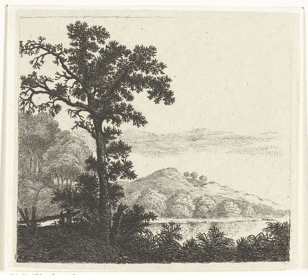 Editor: This is "View Taken in the Region of Subiaco," a lithograph, engraving, and drawing print on paper from 1818, made by Constant Bourgeois. The delicate linework and shading create a real sense of depth. I find myself drawn to the way the distant buildings sit perched atop the hill, but also very focused on the dense trees. What elements of composition and texture strike you most powerfully? Curator: The piece demonstrates an interesting tension between linear precision and atmospheric diffusion. The lithographic technique employed allows for subtle tonal gradations in the sky and distant mountains, creating a sense of aerial perspective. Note, however, the sharp, almost graphic quality of the trees in the foreground, achieved through engraving and drawing. How do these contrasting techniques contribute to the overall visual experience, in your view? Editor: I see what you mean about the tension. It’s almost as if there are two different levels of reality presented. The buildings and trees feel both near and impossibly far, real, but maybe idealized as well. So it sounds like the techniques work together to accomplish a purpose? Curator: Precisely. The formal interplay of these techniques results in a work that both represents and interprets the landscape. Consider, too, the careful arrangement of forms, guiding the viewer's eye from the detailed foreground elements to the more simplified forms in the background. The strategic distribution of light and shadow also contributes to the overall coherence and visual impact. Do you see how each part contributes to the feeling that you mention earlier? Editor: Yes, absolutely. I hadn’t thought so explicitly about the techniques used, but now the artistic intention seems much clearer. It all makes much more sense when considered together. Curator: Indeed, a formalist approach invites us to attend to the intrinsic elements of a work. Attending to those internal qualities of an artwork offers another pathway for art appreciation.