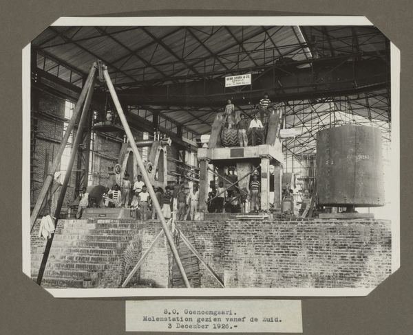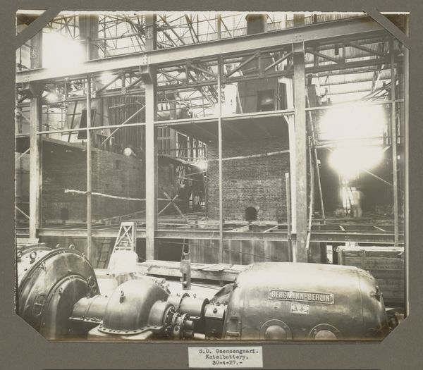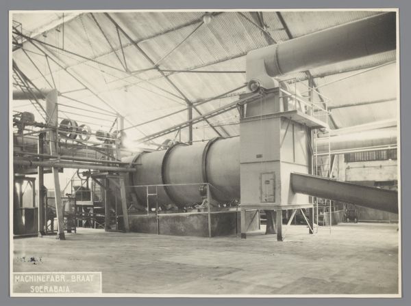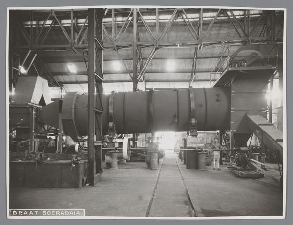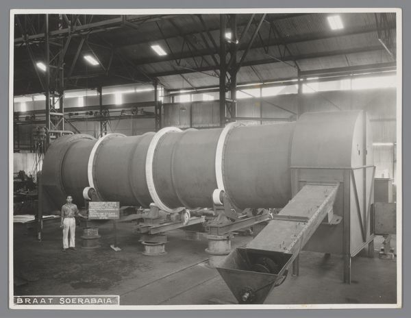 Curator: Let's talk about this gelatin-silver print called "Koeltrog" created sometime between 1920 and 1922, and it is now in the Rijksmuseum. Editor: It's massive! My first thought is that this… tank, I guess? looks like something Jules Verne would've dreamed up. A touch of steampunk well before its time! There's something imposing, but also curiously fragile about it sitting there on that rail carriage. Curator: It's intriguing, isn't it? The photograph was taken during the colonial period in what was then the Dutch East Indies, now Indonesia. “Zending Braat Soerabaia,” printed on the side indicates that it probably had a specific role related to shipping and potentially industrial use around the city of Surabaya. Editor: Surabaya... the "City of Heroes!" Which immediately adds another layer to its almost-mythical quality. Knowing that adds weight, and makes you wonder about the workers and colonial hands whose lives were woven with this contraption. Makes you want to run your hand along it, or at least wish you could. Curator: Precisely! The text itself highlights a critical point, a mission associated with the Braat company. Photography, in such contexts, served not just to document but to project industrial progress and colonial power. Editor: It also leaves me wondering about its scale and the kind of person who worked around it. The industrial nature contrasts sharply with its transportation. Almost like something captured mid-journey. Curator: Indeed. The anonymous authorship encourages us to look beyond individual artistic expression. Consider instead how this image operated within the Dutch colonial system. Editor: Anonymous adds to that almost surreal distance to me; we focus more on its impact now. Knowing its location contextualizes everything. It transforms this scene from a simple industrial document into a more multifaceted portrait of progress, power, and possibly exploitation. Curator: Exactly, seeing “Koeltrog” reveals aspects of a society managing new technologies and global politics. The photo acts as an access point for the Dutch presence during this period. Editor: I'm really drawn to its presence as a ghost that sparks questions. I will hold it in my memory for a while, letting its subtle message continue to linger.