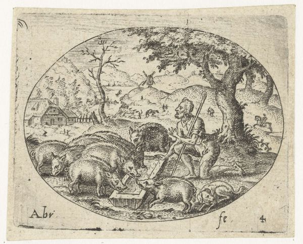 Curator: What a striking composition! The diagonal line from the lower left to the upper right really draws the eye. Editor: Indeed. We’re looking at Sebald Beham’s "Prodigal Son Keeping his Swine." Beham, active in the 16th century, captures the biblical scene in this small print, only about 7 by 12 centimeters, currently held at the Harvard Art Museums. Curator: The way Beham uses hatching and cross-hatching is remarkable, creating such depth and texture. Look at the rugged landscape versus the softness of the swine. Editor: Right, and remember Beham was part of the Little Masters, a group known for their small-scale, intricate engravings. This print demonstrates how religious narratives were being reshaped by the Reformation. It’s a moment of introspection set against a changing social landscape. Curator: The contrast between the kneeling figure and the grazing pigs really underscores the prodigal son's degradation, and the landscape behind, his isolation. Editor: It really makes one think about the socio-economic implications of sin and repentance in that period. The artist’s attention to the details, like the texture of the pigs, is impressive. Curator: Agreed. It’s a study in textures, a visual exploration of form and spirit, all in a remarkably intimate format. Editor: A humbling piece. The social context enriches the impact of Beham's artistry.