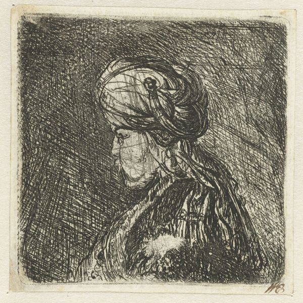 Curator: What a striking portrait! We’re looking at an etching and engraving by Jan Chalon, titled "Ooude vrouw met zwarte sluier," or "Old Woman with Black Veil," likely created between 1748 and 1795. Editor: It certainly is… stark. The heavy use of lines to define form creates a rather somber, almost mournful mood. Her downcast eyes and pursed lips... she carries a certain weight, doesn't she? Curator: Absolutely. These kinds of portraits, particularly of older individuals, often served a didactic function. They were moralizing images, reflecting on the passage of time, the virtues of piety, or perhaps the societal roles assigned to women of a certain age. The "black veil" itself carries symbolic weight, hinting at widowhood or a life dedicated to faith. Editor: Function aside, look at the technique! Chalon's mastery of line weight and cross-hatching is what gives the piece its power. Notice how the density of the lines around her face emphasize the wrinkles and texture of her skin, contrasting with the softer treatment of the veil. It is creating dramatic chiaroscuro effects. Curator: And, of course, this piece was likely part of a larger printmaking culture. It might have circulated among a particular social class or been used for educational purposes. Prints allowed for wider dissemination of images, influencing ideas and beliefs. The choice of an elderly woman as a subject… was that an expression of respect, or something else? It prompts us to consider the image within a particular cultural context. Editor: Hmm, interesting perspective. For me, beyond its social implications, it’s the formal arrangement that captivates. The framing of her face, the strategic deployment of shadow… everything serves to focus the viewer on her internal world, regardless of whatever message society at the time was trying to send. Curator: Indeed, we are both bringing our perspectives to bear on a relatively small but fascinating piece, and by appreciating both the social function and formal technique, hopefully listeners gain new insights. Editor: Right you are, seeing both the historical context and aesthetic elements can really enrich how we understand a piece like this.