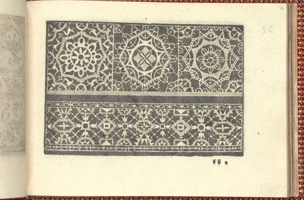 Editor: So, this is a page from Cesare Vecellio’s *Corona delle Nobili et Virtuose Donne*, published in 1601. It's a book of lace patterns, done in engraving. The detail is amazing. It feels so…intricate and almost mathematical. What’s your read on this particular image? Curator: It's fascinating to consider this within the broader social history. Lace was a significant status symbol in the Renaissance, right? These books served as guides, standardizing and disseminating fashionable patterns among elite women, shaping visual culture. But who actually made the lace based on these designs? Editor: That's a good point. I hadn't thought about the actual labor involved. Were these books primarily for wealthy women to execute themselves, or were they meant for professional lace makers? Curator: A key question! I suspect, especially with these intricate patterns, it would often have been skilled artisans creating the work. The book then serves as a sort of catalog, dictating what designs are socially desirable and therefore economically valuable. How does seeing it that way change your perception? Editor: It definitely adds a layer. It's no longer just pretty patterns, but a reflection of economic power and a very early form of mass-produced design. Were there other ways this kind of imagery was politically charged? Curator: Absolutely. Sumptuary laws, for example, often regulated who could wear what kind of lace. These pattern books, by making these styles accessible *in print*, challenge that rigid hierarchy. Did pattern books affect the creative role for individual makers in any apparent ways? Editor: I guess if everyone’s working from the same source material, you might see less regional variation, more standardization. That’s slightly sad! It seems the personal flair or particular local traditions may be lost in favour of broader adoption and wider audiences. Curator: Exactly. It makes you think about the tensions between individual artistry and the pressures of commercial success, even back then. This has certainly given me a deeper appreciation of the sociopolitical implications of something as seemingly decorative as a lace pattern.